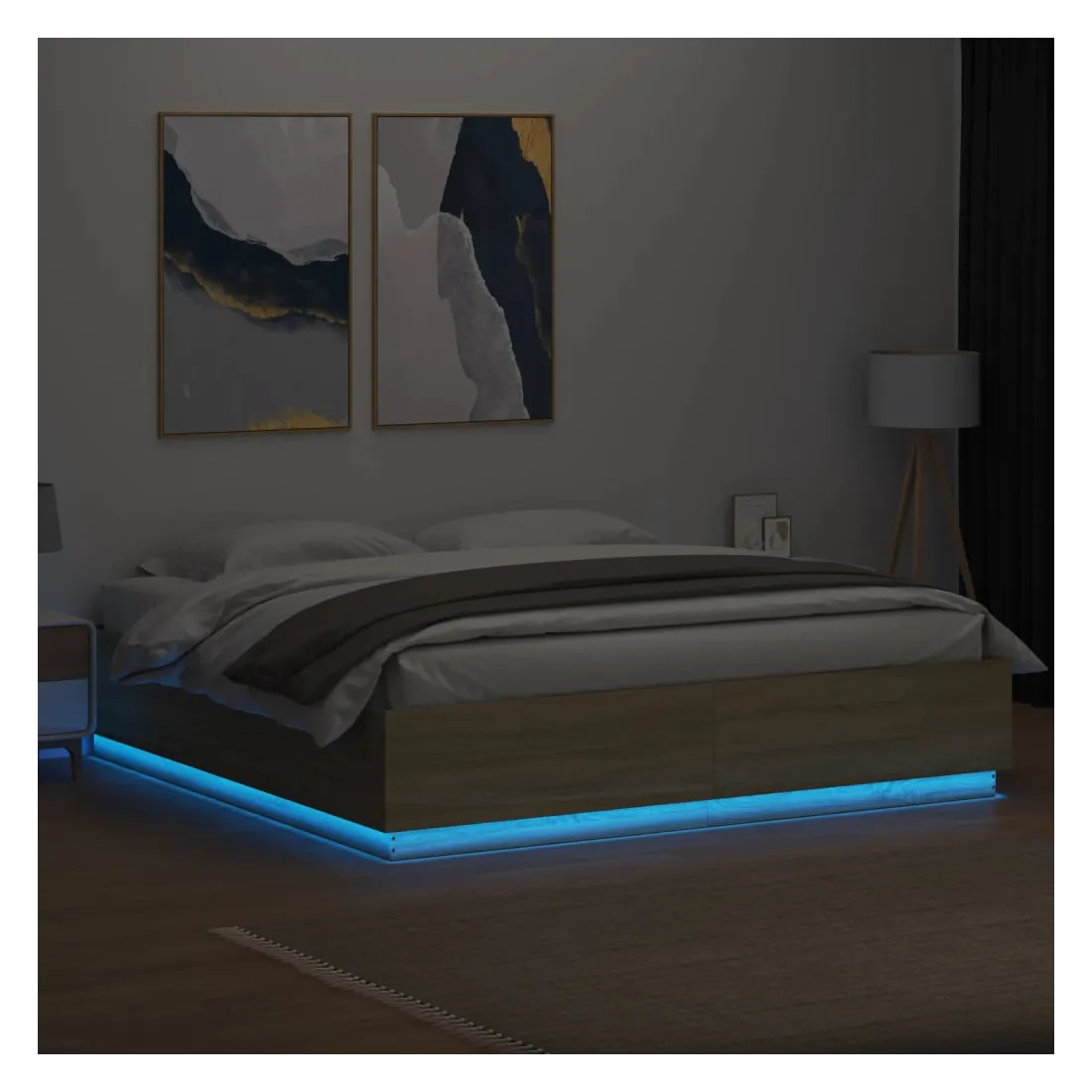 Obtenez une meilleure nuit de sommeil reposante grâce à ce cadre de lit avec lumières LED ! Il est un supplément accueillant à toute chambre à coucher. Matériau durable : le bois d'ingénierie est d'une qualité exceptionnelle avec une surface lisse et présente également résistance, stabilité et résistance à l'humidité.Lumières LED RVB : le cadre de lit est équipé de lumières LED RVB vibrantes. Avec divers menus personnalisables, vous pouvez changer sans effort la couleur des lumières et même les régler automatiquement. Ces lumières LED renforcent non seulement l'aspect contemporain du sommier, mais ajoutent également à son attrait tendance.Lattes robustes : les lattes de contreplaqué assurent une bonne répartition du poids, garantissant que le matelas reste en place à chaque torsion de votre corps pendant le sommeil. Bon à savoir :Un matelas n'est pas inclus avec ce lit. Nous offrons une sélection variée de matelas. Vous pouvez consulter notre boutique pour trouver un matelas assorti.Ce produit est doté d'un connecteur USB qui nécessite une source d'alimentation USB de 5V certifiée (non incluse).