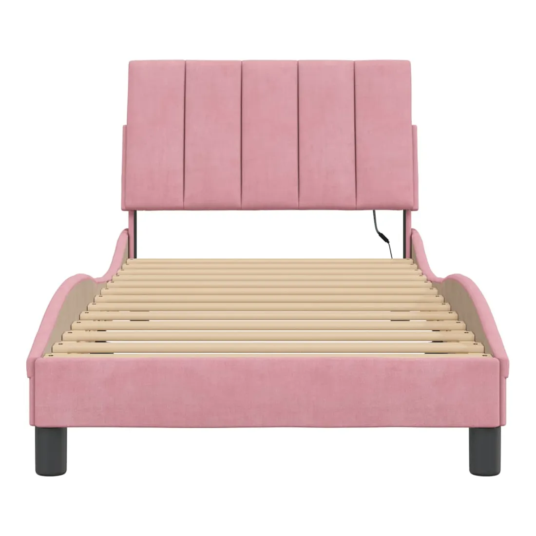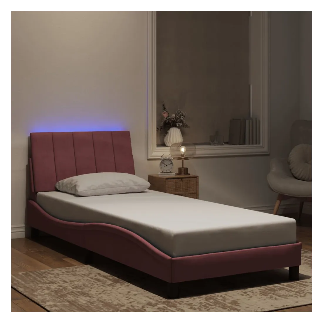 Obtenez une meilleure nuit de sommeil reposante grâce à ce cadre de lit avec lumières LED ! Il est un supplément accueillant à toute chambre à coucher. Velours doux : le velours est un tissu doux et confortable, agréable au toucher.Lattes de contreplaqué : les lattes de contreplaqué assurent une bonne répartition du poids, garantissant que le matelas reste en place à chaque torsion de votre corps pendant le sommeil.Excellent soutien : la tête de lit vous offre un excellent soutien du dos lorsque vous êtes assis dans votre lit pour lire ou regarder la télévision.Bande LED colorée : apportez de la gaieté dans l'obscurité avec des lumières LED colorées ! Les bandes auto-agrippantes situées à l'arrière du coussin de la tête de lit peuvent être utilisées pour fixer les lumières LED.Design latéral ondulé : l’aspect ondulé du cadre de lit est élégant et sophistiqué, ajoutant une touche moderne et élégante à votre décor, ce qui en fait le point central de votre chambre à coucher. Bon à savoir :Un matelas n'est pas inclus avec ce lit. Nous offrons une sélection variée de matelas. Vous pouvez consulter notre boutique pour trouver un matelas assorti.Ce produit est doté d'un connecteur USB qui nécessite une source d'alimentation USB de 5V certifiée (non incluse).