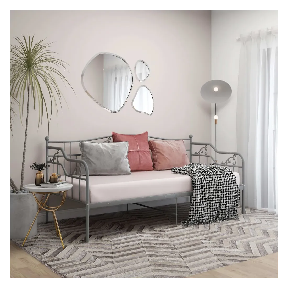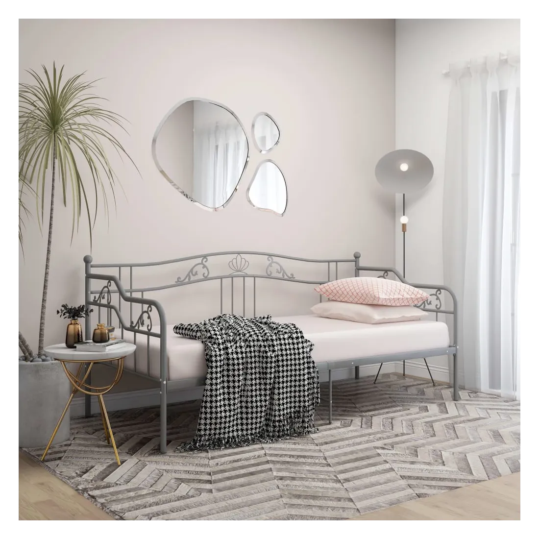Ce canapé-lit élégant est censé être une solution parfaite pour accueillir des invités inattendus pendant la nuit tout en offrant un espace confortable pendant la journée. Vous pouvez facilement convertir ce meuble en un canapé pendant la journée et en un lit confortable la nuit. Le cadre du lit de jour maximise l’espace disponible au sol tout en offrant un espace de couchage, ce qui en fait un choix idéal pour les personnes ayant un espace de vie limité. De plus, le lit d'appoint est équipé d’une barrière latérale qui empêche l’utilisateur de rouler tout en dormant. Le cadre de lit entier a une construction métallique robuste, ce qui le rend très durable, et adapté à une utilisation quotidienne. Veuillez noter que la livraison comprend le cadre de lit uniquement. Les matelas ne sont pas inclus. Vous pouvez consulter notre boutique pour les matelas assortis.