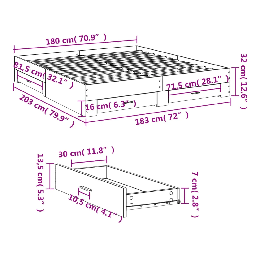 - Dimensions des tiroirs de lit (S) : 71,5 x 31,5 x 13,5 cm (L x l x H)