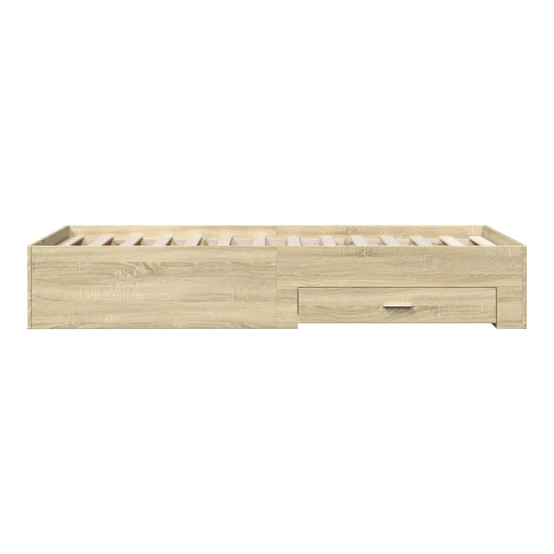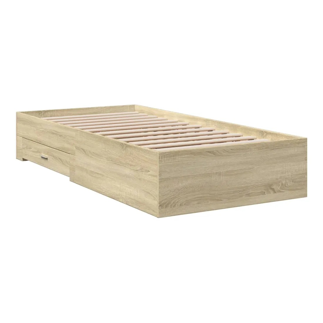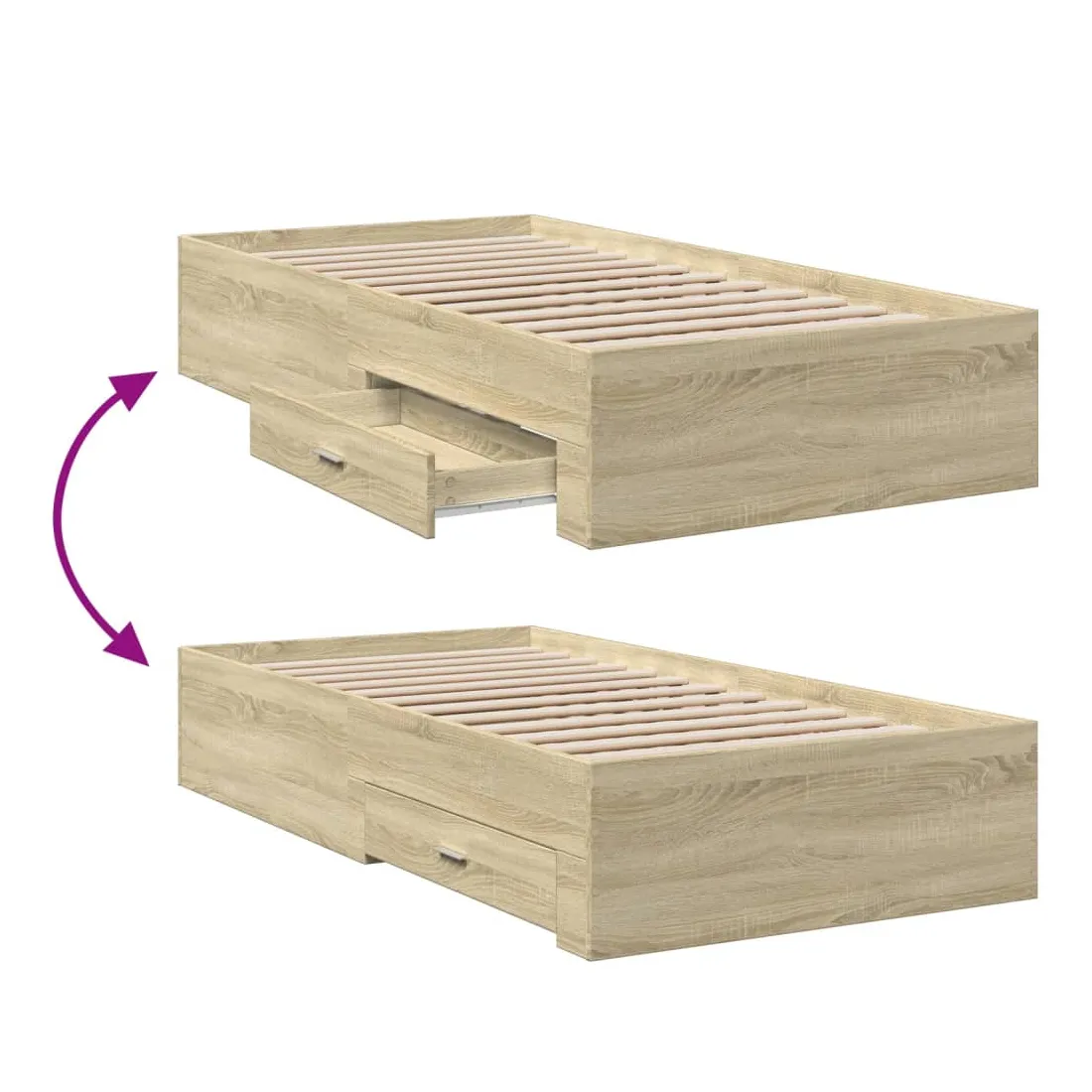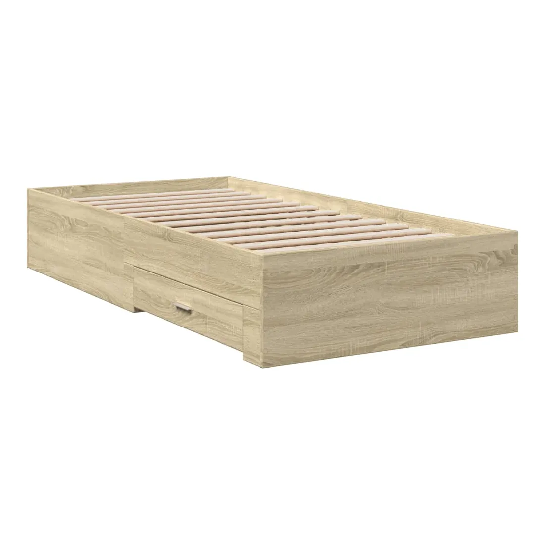 Ajoutez une touche moderne à votre chambre à coucher avec ce cadre de lit avec tiroirs ! Il apportera une touche pratique et décorative à votre espace de vie. Matériau durable : le cadre de lit est fabriquée en bois d'ingénierie. Le bois d'ingénierie est d'une qualité exceptionnelle avec une surface lisse et présente également de la résistance, de la stabilité et de la résistance à l'humidité.Lattes robustes : les lattes de contreplaqué assurent une bonne répartition du poids, garantissant que le matelas reste en place à chaque torsion de votre corps pendant le sommeil.Fonction de rangement : les tiroirs de lit inclus offrent suffisamment d'espace de rangement pour ranger vos articles essentiels, gardant votre pièce propre et bien rangée. Bon à savoir :Un matelas n'est pas inclus avec ce lit. Nous offrons une sélection variée de matelas. Vous pouvez consulter notre boutique pour trouver un matelas assorti.