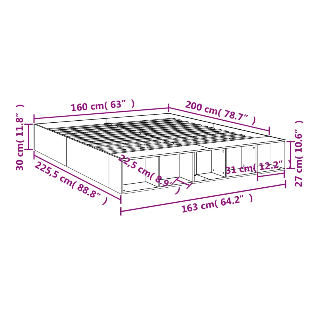 - Dimensions totales : 225,5 x 163 x 30 cm (L x l x H)