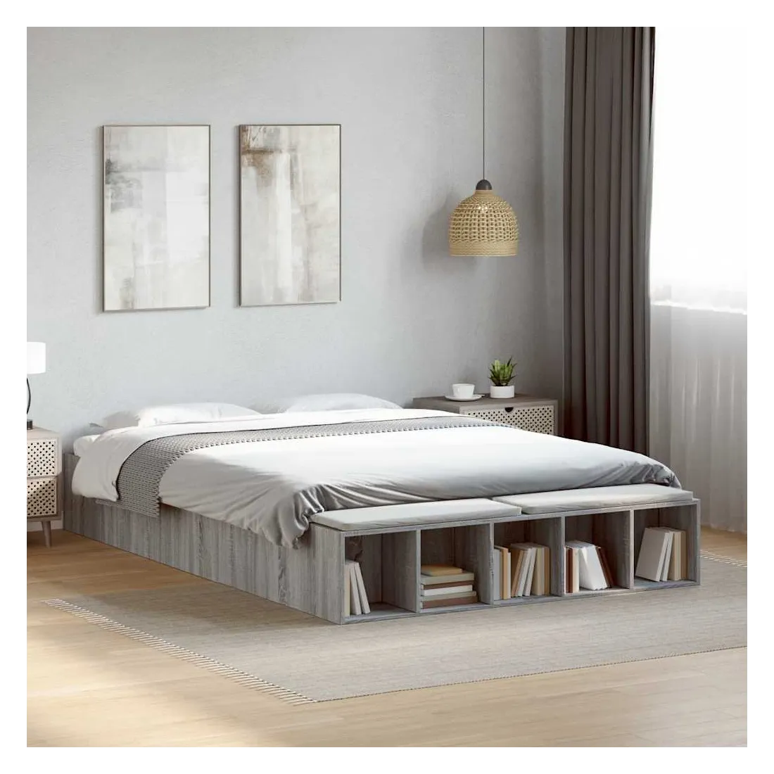 Ajoutez une touche moderne à votre chambre à coucher avec ce cadre de lit ! Il apportera une touche pratique et décorative à votre espace de vie. Matériau durable : le cadre de lit est fabriquée en bois d'ingénierie. Le bois d'ingénierie est d'une qualité exceptionnelle avec une surface lisse et présente également de la résistance, de la stabilité et de la résistance à l'humidité.Lattes robustes : les lattes de contreplaqué assurent une bonne répartition du poids, garantissant que le matelas reste en place à chaque torsion de votre corps pendant le sommeil.Fonction de rangement : les compartiments de lit inclus offrent un grand espace de rangement pour ranger vos articles essentiels, gardant votre chambre propre et bien rangée. Bon à savoir :Un matelas n'est pas inclus avec ce lit. Nous offrons une sélection variée de matelas. Vous pouvez consulter notre boutique pour trouver un matelas assorti.