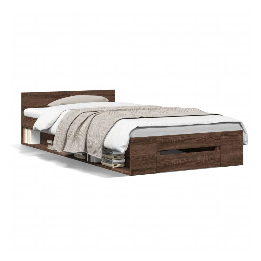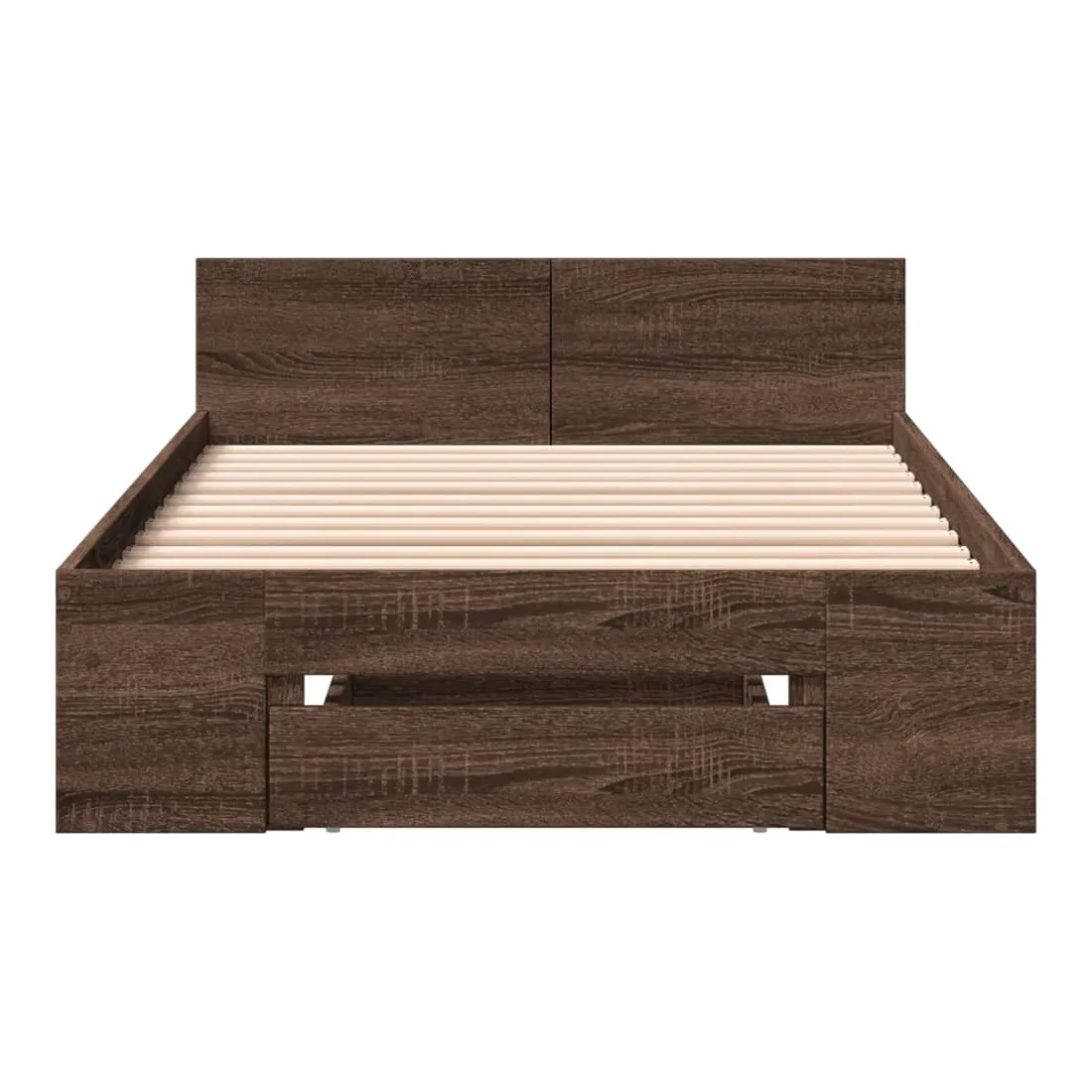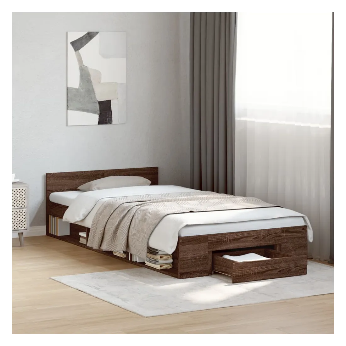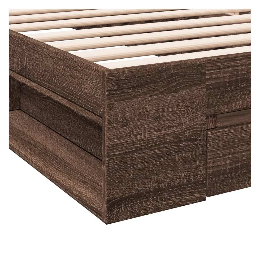 Ajoutez une touche moderne à votre chambre à coucher avec ce cadre de lit avec tiroir ! Il apportera une touche pratique et décorative à votre espace de vie. Matériau durable : le cadre de lit est fabriquée en bois d'ingénierie. Le bois d'ingénierie est d'une qualité exceptionnelle avec une surface lisse et présente également de la résistance, de la stabilité et de la résistance à l'humidité.Lattes robustes : les lattes de contreplaqué assurent une bonne répartition du poids, garantissant que le matelas reste en place à chaque torsion de votre corps pendant le sommeil.Fonction de rangement : le tiroir de lit et les compartiments latéraux inclus offrent suffisamment d'espace de rangement pour ranger vos articles essentiels, gardant votre pièce propre et bien rangée. Bon à savoir :Un matelas n'est pas inclus avec ce lit. Nous offrons une sélection variée de matelas. Vous pouvez consulter notre boutique pour trouver un matelas assorti.