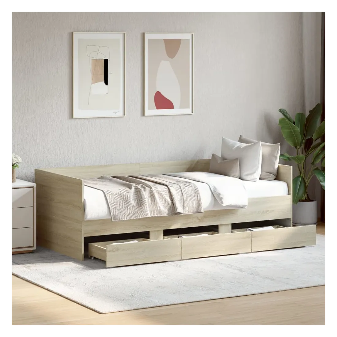 Ce lit de repos 2 en 1 avec tiroirs, servant à la fois de canapé et de lit, constitue un ajout pratique et accrocheur à votre salon ou chambre à coucher. Lit de repos polyvalent : le canapé-lit fonctionne comme un canapé pendant la journée et se transforme facilement en lit double la nuit en retirant le lit gigogne, offrant une solution pratique pour accueillir des invités et maximiser l'espace. Grand espace de rangement : ce lit d'appoint dispose de 3 tiroirs à roulettes qui offrent suffisamment d'espace pour ranger vos vêtements, chaussettes, jouets, coussins, etc.Construction solide : ce canapé-lit est doté d'un cadre robuste en bois d'ingénierie. Le bois d'ingénierie est d'une qualité exceptionnelle avec une surface lisse et se caractérise par sa solidité, sa stabilité et sa résistance à l'humidité. Bon à savoir :La livraison comprend uniquement un cadre de lit de jour. Le matelas n'est pas inclus. Vous pouvez consulter notre boutique pour trouver les matelas assortis.