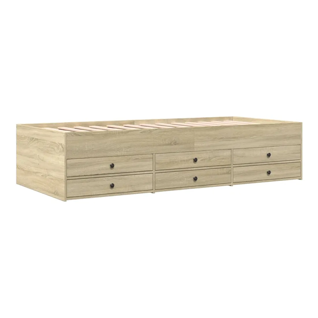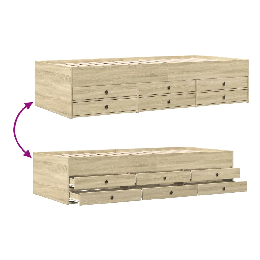 Ce lit de repos 2 en 1 avec tiroirs, servant à la fois de canapé et de lit, constitue un ajout pratique et accrocheur à votre salon ou chambre à coucher. Méridienne polyvalente : Le canapé-lit fait office de canapé le jour ou de lit la nuit, ce qui constitue une solution pratique pour accueillir des invités et optimiser l'espace. Grand espace de rangement : ce lit d'appoint dispose de 6 tiroirs à roulettes qui offrent suffisamment d'espace pour ranger vos vêtements, chaussettes, jouets, coussins, etc.Construction solide : ce canapé-lit est doté d'un cadre robuste en bois d'ingénierie. Le bois d'ingénierie est d'une qualité exceptionnelle avec une surface lisse et se caractérise par sa solidité, sa stabilité et sa résistance à l'humidité. Bon à savoir :La livraison comprend uniquement un cadre de lit de jour. Le matelas n'est pas inclus. Vous pouvez consulter notre boutique pour trouver les matelas assortis.