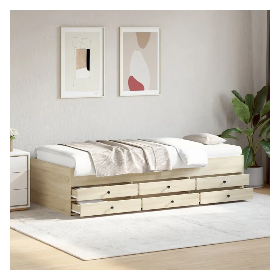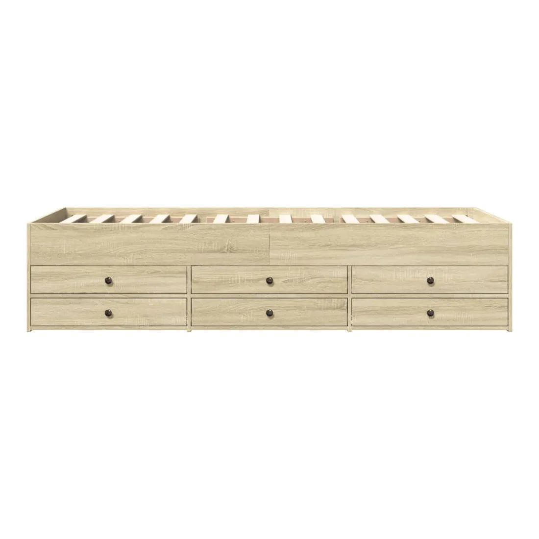 Ce lit de repos 2 en 1 avec tiroirs, servant à la fois de canapé et de lit, constitue un ajout pratique et accrocheur à votre salon ou chambre à coucher. Méridienne polyvalente : Le canapé-lit fait office de canapé le jour ou de lit la nuit, ce qui constitue une solution pratique pour accueillir des invités et optimiser l'espace. Grand espace de rangement : ce lit d'appoint dispose de 6 tiroirs à roulettes qui offrent suffisamment d'espace pour ranger vos vêtements, chaussettes, jouets, coussins, etc.Construction solide : ce canapé-lit est doté d'un cadre robuste en bois d'ingénierie. Le bois d'ingénierie est d'une qualité exceptionnelle avec une surface lisse et se caractérise par sa solidité, sa stabilité et sa résistance à l'humidité. Bon à savoir :La livraison comprend uniquement un cadre de lit de jour. Le matelas n'est pas inclus. Vous pouvez consulter notre boutique pour trouver les matelas assortis.