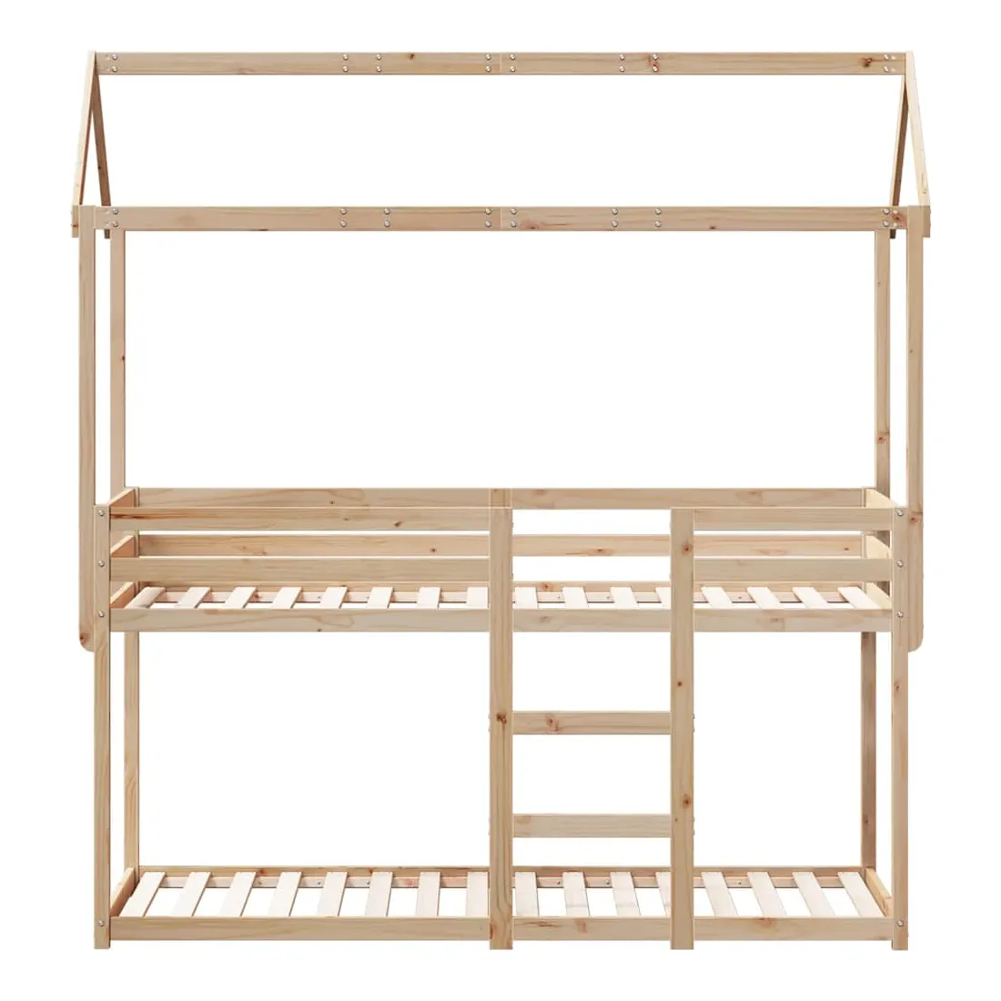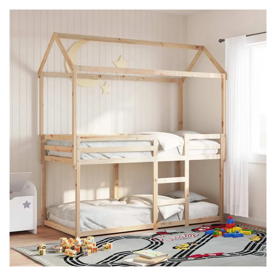 Ce lit superposé pour enfants avec toit est élégant et fonctionnel, ce qui en fait un ajout parfait à toute pièce avec un espace limité. Bois de pin massif : le bois de pin massif est un matériau naturel magnifique. Le bois de pin a un grain droit et les nœuds donnent au matériau son aspect caractéristique et rustique.Design sûr : le lit surélevé est conçu dans un souci de sécurité. Il comprend des garde-corps qui empêchent l'utilisateur de rouler pendant son sommeil.Lattes de contreplaqué : les lattes de contreplaqué assurent une bonne répartition du poids, garantissant que le matelas reste en place à chaque torsion de votre corps pendant le sommeil.Très amusant : en combinant le toit avec le lit de votre enfant, vous pouvez créer une cachette qui permettra à votre enfant de s'amuser à l'heure du coucher. Cette addition innovante non seulement sera un point focal passionnant, mais aussi apportera de la fantaisie et de l'amusement dans la chambre d'enfant.Convient aux espaces limités : le cadre de lit est un excellent choix pour toute pièce dont l'espace est limité, il fournit deux lits individuels avec un design compact.Porte latérale ouverte : le toit est doté d'une porte latérale ouverte qui permet à vos enfants d'entrer et de sortir facilement du lit. Bon à savoir :Un matelas n'est pas inclus avec ce lit. Nous offrons une sélection variée de matelas. Vous pouvez consulter notre boutique pour trouver un matelas assorti.