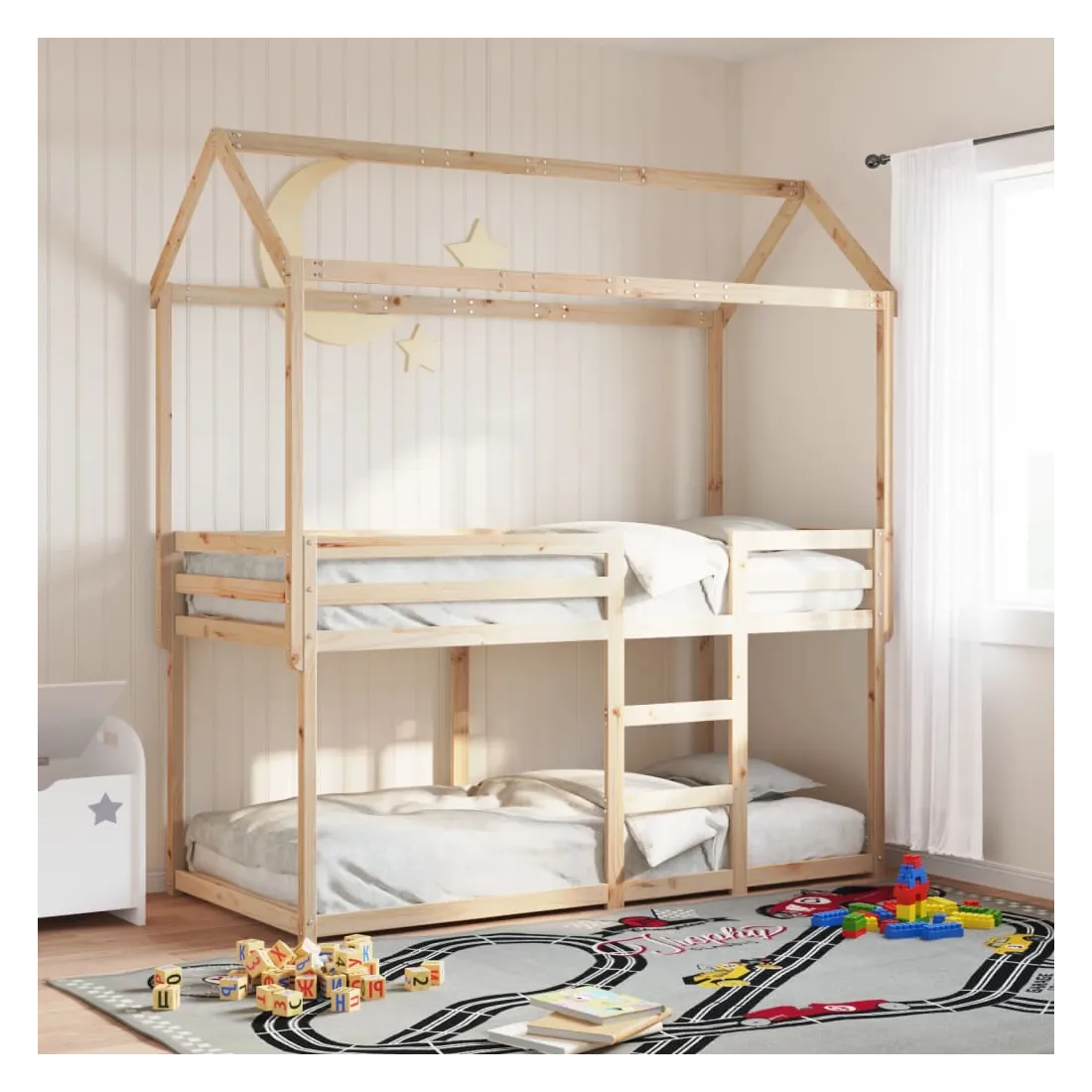 Ce lit superposé pour enfants avec toit est élégant et fonctionnel, ce qui en fait un ajout parfait à toute pièce avec un espace limité. Bois de pin massif : le bois de pin massif est un matériau naturel magnifique. Le bois de pin a un grain droit et les nœuds donnent au matériau son aspect caractéristique et rustique.Design sûr : le lit surélevé est conçu dans un souci de sécurité. Il comprend des garde-corps qui empêchent l'utilisateur de rouler pendant son sommeil.Lattes de contreplaqué : les lattes de contreplaqué assurent une bonne répartition du poids, garantissant que le matelas reste en place à chaque torsion de votre corps pendant le sommeil.Très amusant : en combinant le toit avec le lit de votre enfant, vous pouvez créer une cachette qui permettra à votre enfant de s'amuser à l'heure du coucher. Cette addition innovante non seulement sera un point focal passionnant, mais aussi apportera de la fantaisie et de l'amusement dans la chambre d'enfant.Convient aux espaces limités : le cadre de lit est un excellent choix pour toute pièce dont l'espace est limité, il fournit deux lits individuels avec un design compact.Porte latérale ouverte : le toit est doté d'une porte latérale ouverte qui permet à vos enfants d'entrer et de sortir facilement du lit. Bon à savoir :Un matelas n'est pas inclus avec ce lit. Nous offrons une sélection variée de matelas. Vous pouvez consulter notre boutique pour trouver un matelas assorti.