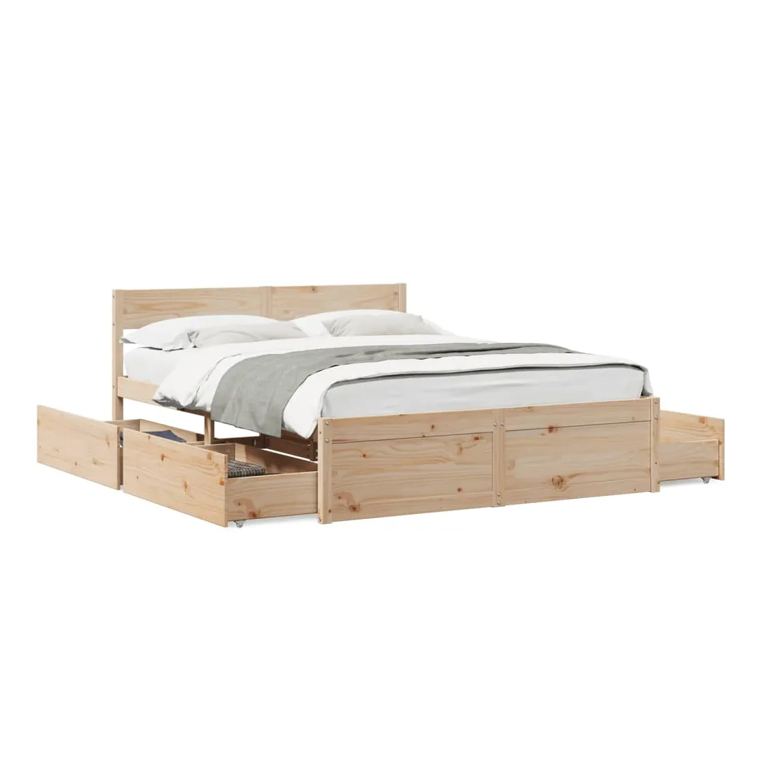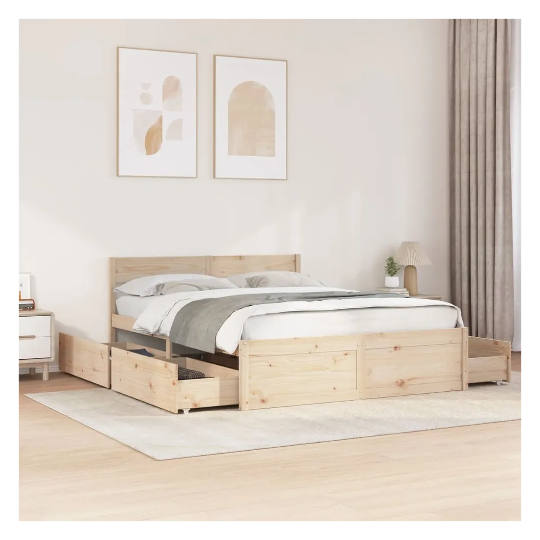 Ajoutez une touche moderne à votre chambre à coucher avec ce cadre de lit avec tiroirs ! Il apportera une touche pratique et décorative à votre espace de vie. Cadre stable et durable : le bois de pin massif est connu pour sa résistance et sa durabilité. Ses grains droits et ses nœuds distinctifs contribuent à son charme rustique.Lattes de contreplaqué : les lattes de contreplaqué assurent une bonne répartition du poids, garantissant que le matelas reste en place à chaque torsion de votre corps pendant le sommeil.Fonction de rangement : les tiroirs de lit inclus offrent suffisamment d'espace de rangement pour ranger vos articles essentiels, gardant votre pièce propre et bien rangée.Tête de lit polyvalente : ce cadre de lit est équipé d'une tête de lit qui offre un excellent soutien dorsal lorsque vous vous asseyez dans le lit pour lire ou regarder la télévision, tout en servant d'élément décoratif. Bon à savoir :Un matelas n'est pas inclus avec ce lit. Nous offrons une sélection variée de matelas. Vous pouvez consulter notre boutique pour trouver un matelas assorti.
