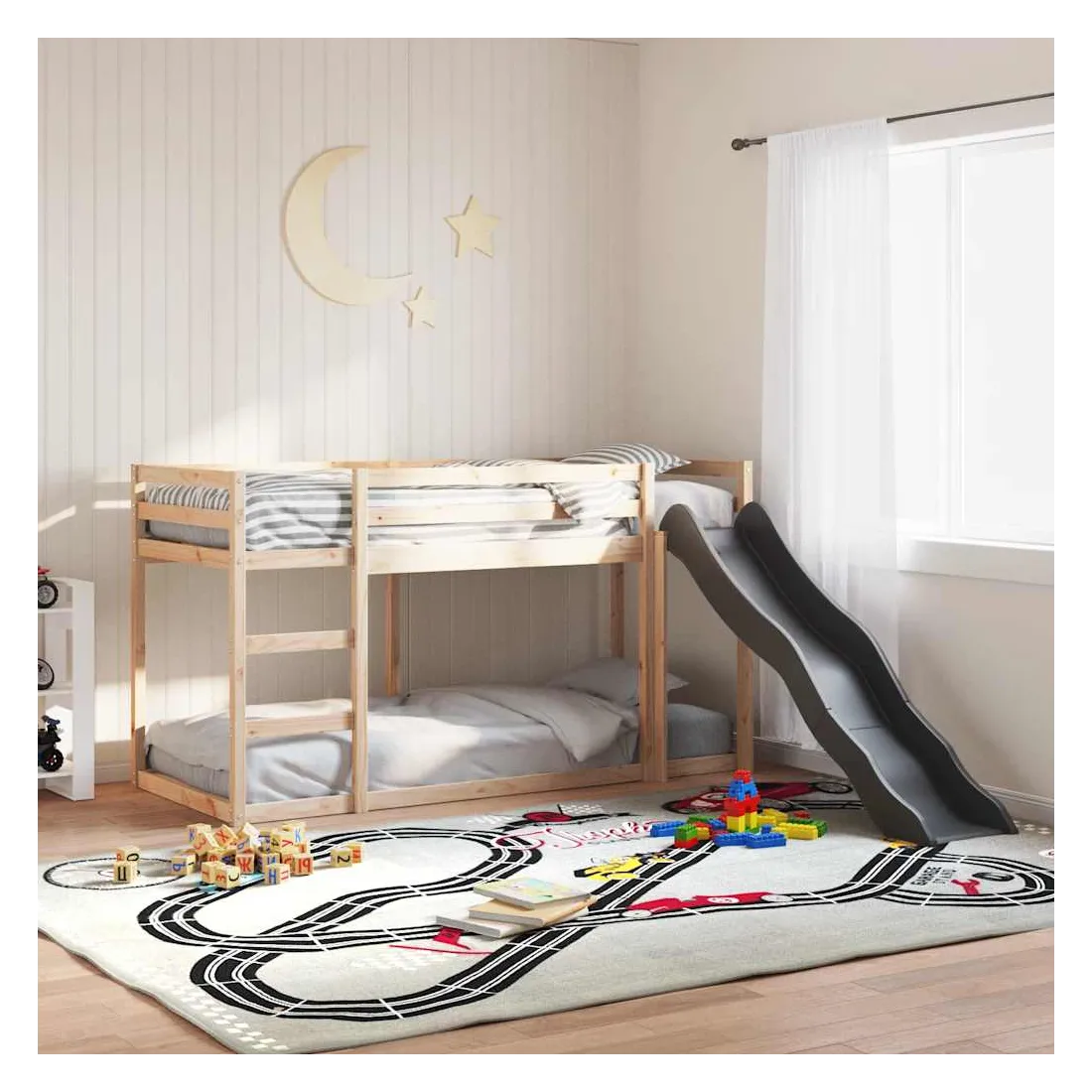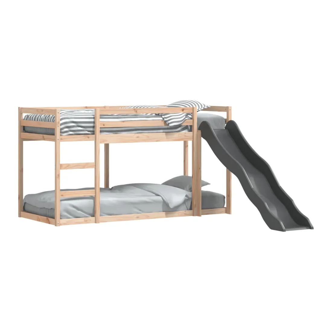 Ce lit superposé en bois avec toboggan et échelle est conçu pour divertir et optimiser l'espace. Robuste et stable : le bois de pin massif est connu pour sa résistance et sa durabilité. Ses grains droits et ses nœuds distinctifs contribuent à son charme rustique.Barrières de sécurité : le lit mezzanine pour enfants est équipé de garde-corps de sécurité sur les 4 côtés, afin que votre enfant puisse dormir sans craindre de tomber.Pleine utilisation de l'espace : le lit inférieur de ce lit superposé pour enfants est posé sur le sol, ce qui vous permet de placer un matelas au niveau inférieur ou d'utiliser le niveau inférieur comme espace de rangement ou de jeu.Échelle et toboggan pratiques : ce lit mi-hauteur pour enfants est doté d'un toboggan amusant qui apporte de la joie et transforme leur chambre en une aire de jeux intérieure. La combinaison d'une échelle d'escalade et d'un toboggan rend l'heure du coucher plus vivante et plus intéressante pour les enfants. Bon à savoir :La livraison comprend uniquement les cadres de lit. Les matelas ne sont pas inclus. Vous pouvez consulter notre boutique pour trouver les matelas assortis. Attention :Pour éviter qu'il ne bascule, ce produit doit être utilisé avec le dispositif de fixation murale fourni.