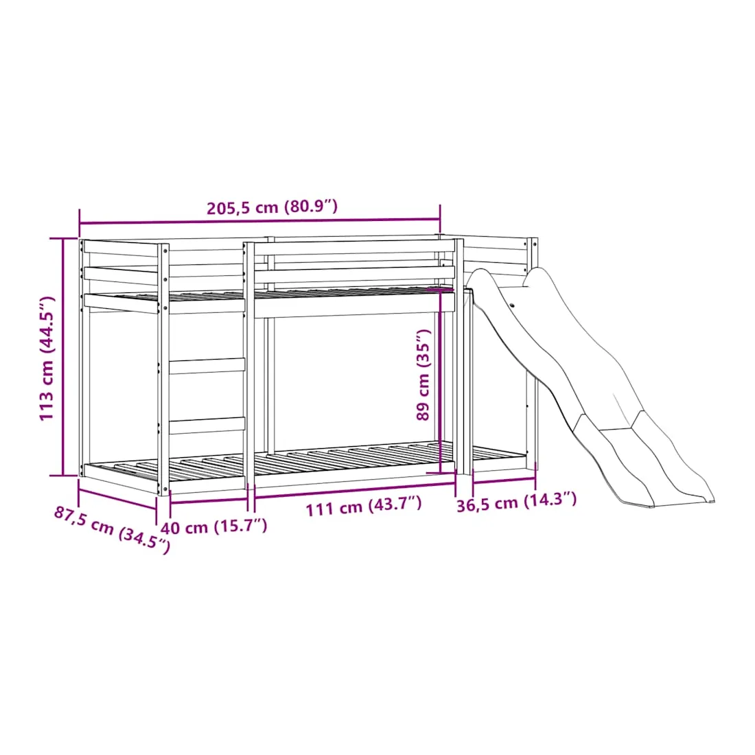 Ce lit superposé en bois avec toboggan et échelle est conçu pour divertir et optimiser l'espace. Robuste et stable : le bois de pin massif est connu pour sa résistance et sa durabilité. Ses grains droits et ses nœuds distinctifs contribuent à son charme rustique.Barrières de sécurité : le lit mezzanine pour enfants est équipé de garde-corps de sécurité sur les 4 côtés, afin que votre enfant puisse dormir sans craindre de tomber.Pleine utilisation de l'espace : le lit inférieur de ce lit superposé pour enfants est posé sur le sol, ce qui vous permet de placer un matelas au niveau inférieur ou d'utiliser le niveau inférieur comme espace de rangement ou de jeu.Échelle et toboggan pratiques : ce lit mi-hauteur pour enfants est doté d'un toboggan amusant qui apporte de la joie et transforme leur chambre en une aire de jeux intérieure. La combinaison d'une échelle d'escalade et d'un toboggan rend l'heure du coucher plus vivante et plus intéressante pour les enfants. Bon à savoir :La livraison comprend uniquement les cadres de lit. Les matelas ne sont pas inclus. Vous pouvez consulter notre boutique pour trouver les matelas assortis. Attention :Pour éviter qu'il ne bascule, ce produit doit être utilisé avec le dispositif de fixation murale fourni.