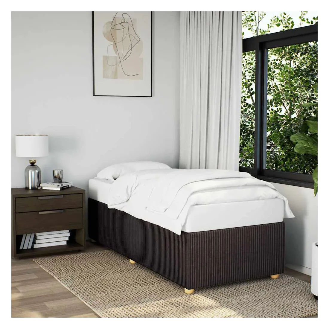 Profitez d'une meilleure nuit de sommeil reposante grâce à ce cadre de lit ! Il est un supplément accueillant à toute chambre à coucher. Matériau doux et durable : le tissu en polyester allie douceur, respirabilité et durabilité, vous garantissant un confort et une convivialité ultimes.Lattes pour un soutien optimal : ce cadre de lit est complété par des lattes pour offrir un soutien et une respirabilité essentiels à votre matelas.Pieds stables et durables : ce lit est soutenu par des pieds robustes, ce qui garantit sa stabilité, sa sécurité et sa fermeté. Bon à savoir :Un matelas n'est pas inclus avec ce lit. Nous offrons une sélection variée de matelas. Vous pouvez consulter notre boutique pour trouver un matelas assorti.
