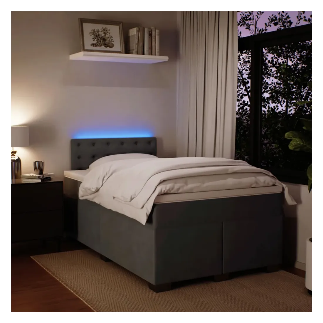 Utilisez ce lit à sommier pour profiter d'une nuit de sommeil réparatrice ! Il vous offre une relaxation maximale et un sommeil agréable. Matériau doux et confortable : le tissu en velours présente une surface douce et lisse qui offre une sensation agréable contre la peau, vous apportant chaleur et confort ultime.Matelas à ressorts ensachés : ce matelas à ressorts ensachés comporte des ressorts ensachés individuels qui fonctionnent indépendamment pour offrir un soutien personnalisé en réagissant uniquement à la pression exercée dans chaque zone. Cette conception empêche « l'enroulement » et réduit le transfert de mouvement par rapport aux matelas traditionnels à ressorts ouverts. Chaque ressort ensaché soutient le corps individuellement.Lumières LED pour une ambiance agréable : ce lit est équipé de lumières LED qui peuvent être facilement réglées pour créer un spectacle lumineux personnalisé. Vous pouvez personnaliser les modes, les couleurs et la luminosité pour améliorer l'ambiance de votre espace intérieur.Surmatelas confortable : ce surmatelas améliore le soutien et le confort grâce à sa surface douce et respirante, tout en prolongeant la durée de vie de votre matelas. Sa housse amovible permet un lavage facile, ce qui facilite l'entretien. Bon à savoir :Ce produit est doté d'un connecteur USB qui nécessite une source d'alimentation USB de 5V certifiée (non incluse).Pour des raisons d'hygiène, le matelas ne peut pas être retourné si l'emballage est retiré ou ouvert.Seule la partie avec un symbole de ciseaux peut être coupée et seule la partie avec l'USB continuera à fonctionner comme avant.