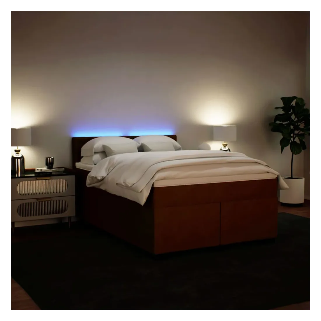 Utilisez ce lit à sommier pour profiter d'une nuit de sommeil réparatrice ! Il vous offre une relaxation maximale et un sommeil agréable. Matériau doux et confortable : le tissu en velours présente une surface douce et lisse qui offre une sensation agréable contre la peau, vous apportant chaleur et confort ultime.Matelas à ressorts ensachés : ce matelas à ressorts ensachés comporte des ressorts ensachés individuels qui fonctionnent indépendamment pour offrir un soutien personnalisé en réagissant uniquement à la pression exercée dans chaque zone. Cette conception empêche « l'enroulement » et réduit le transfert de mouvement par rapport aux matelas traditionnels à ressorts ouverts. Chaque ressort ensaché soutient le corps individuellement.Lumières LED pour une ambiance agréable : ce lit est équipé de lumières LED qui peuvent être facilement réglées pour créer un spectacle lumineux personnalisé. Vous pouvez personnaliser les modes, les couleurs et la luminosité pour améliorer l'ambiance de votre espace intérieur.Surmatelas confortable : ce surmatelas améliore le soutien et le confort grâce à sa surface douce et respirante, tout en prolongeant la durée de vie de votre matelas. Sa housse amovible permet un lavage facile, ce qui facilite l'entretien. Bon à savoir :Ce produit est doté d'un connecteur USB qui nécessite une source d'alimentation USB de 5V certifiée (non incluse).Pour des raisons d'hygiène, le matelas ne peut pas être retourné si l'emballage est retiré ou ouvert.Seule la partie avec un symbole de ciseaux peut être coupée et seule la partie avec l'USB continuera à fonctionner comme avant.