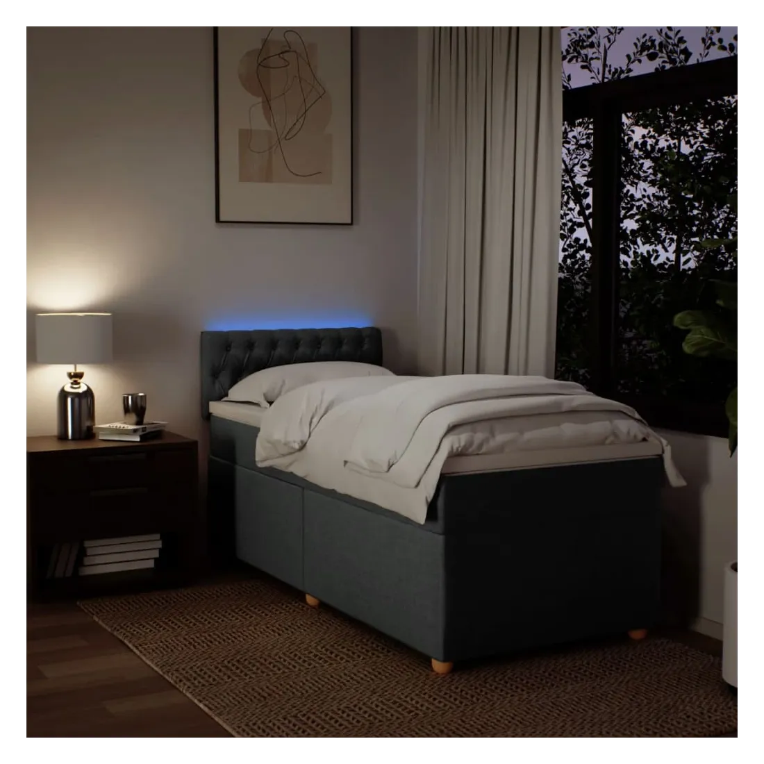 Utilisez ce lit à sommier pour profiter d'une nuit de sommeil réparatrice ! Il vous offre une relaxation maximale et un sommeil agréable. Matériau doux et durable : le tissu en polyester allie douceur, respirabilité et durabilité, vous garantissant un confort et une convivialité ultimes.Matelas à ressorts ensachés : ce matelas à ressorts ensachés comporte des ressorts ensachés individuels qui fonctionnent indépendamment pour offrir un soutien personnalisé en réagissant uniquement à la pression exercée dans chaque zone. Cette conception empêche « l'enroulement » et réduit le transfert de mouvement par rapport aux matelas traditionnels à ressorts ouverts. Chaque ressort ensaché soutient le corps individuellement.Lumières LED pour une ambiance agréable : ce lit est équipé de lumières LED qui peuvent être facilement réglées pour créer un spectacle lumineux personnalisé. Vous pouvez personnaliser les modes, les couleurs et la luminosité pour améliorer l'ambiance de votre espace intérieur.Surmatelas confortable : ce surmatelas améliore le soutien et le confort grâce à sa surface douce et respirante, tout en prolongeant la durée de vie de votre matelas. Sa housse amovible permet un lavage facile, ce qui facilite l'entretien. Bon à savoir :Ce produit est doté d'un connecteur USB qui nécessite une source d'alimentation USB de 5V certifiée (non incluse).Pour des raisons d'hygiène, le matelas ne peut pas être retourné si l'emballage est retiré ou ouvert.Seule la partie avec un symbole de ciseaux peut être coupée et seule la partie avec l'USB continuera à fonctionner comme avant.