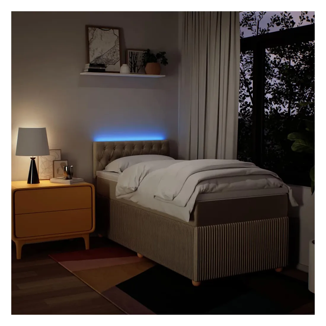 Utilisez ce lit à sommier pour profiter d'une nuit de sommeil réparatrice ! Il vous offre une relaxation maximale et un sommeil agréable. Matériau doux et durable : le tissu en polyester allie douceur, respirabilité et durabilité, vous garantissant un confort et une convivialité ultimes.Matelas à ressorts ensachés : ce matelas à ressorts ensachés comporte des ressorts ensachés individuels qui fonctionnent indépendamment pour offrir un soutien personnalisé en réagissant uniquement à la pression exercée dans chaque zone. Cette conception empêche « l'enroulement » et réduit le transfert de mouvement par rapport aux matelas traditionnels à ressorts ouverts. Chaque ressort ensaché soutient le corps individuellement.Lumières LED pour une ambiance agréable : ce lit est équipé de lumières LED qui peuvent être facilement réglées pour créer un spectacle lumineux personnalisé. Vous pouvez personnaliser les modes, les couleurs et la luminosité pour améliorer l'ambiance de votre espace intérieur.Surmatelas confortable : ce surmatelas améliore le soutien et le confort grâce à sa surface douce et respirante, tout en prolongeant la durée de vie de votre matelas. Sa housse amovible permet un lavage facile, ce qui facilite l'entretien. Bon à savoir :Ce produit est doté d'un connecteur USB qui nécessite une source d'alimentation USB de 5V certifiée (non incluse).Pour des raisons d'hygiène, le matelas ne peut pas être retourné si l'emballage est retiré ou ouvert.Seule la partie avec un symbole de ciseaux peut être coupée et seule la partie avec l'USB continuera à fonctionner comme avant.