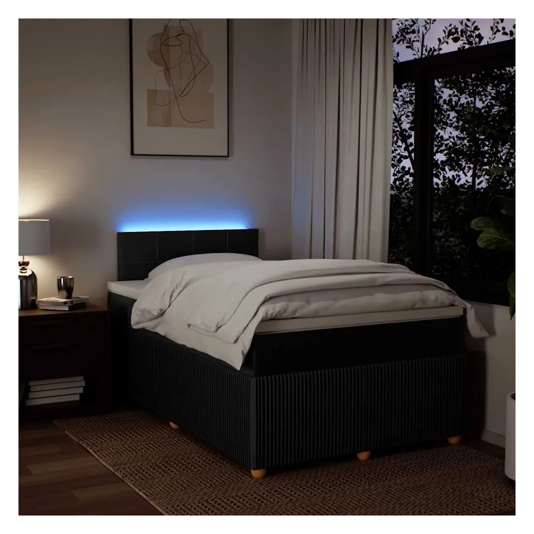 Utilisez ce lit à sommier pour profiter d'une nuit de sommeil réparatrice ! Il vous offre une relaxation maximale et un sommeil agréable. Matériau doux et durable : le tissu en polyester allie douceur, respirabilité et durabilité, vous garantissant un confort et une convivialité ultimes.Matelas à ressorts ensachés : ce matelas à ressorts ensachés comporte des ressorts ensachés individuels qui fonctionnent indépendamment pour offrir un soutien personnalisé en réagissant uniquement à la pression exercée dans chaque zone. Cette conception empêche « l'enroulement » et réduit le transfert de mouvement par rapport aux matelas traditionnels à ressorts ouverts. Chaque ressort ensaché soutient le corps individuellement.Lumières LED pour une ambiance agréable : ce lit est équipé de lumières LED qui peuvent être facilement réglées pour créer un spectacle lumineux personnalisé. Vous pouvez personnaliser les modes, les couleurs et la luminosité pour améliorer l'ambiance de votre espace intérieur.Surmatelas confortable : ce surmatelas améliore le soutien et le confort grâce à sa surface douce et respirante, tout en prolongeant la durée de vie de votre matelas. Sa housse amovible permet un lavage facile, ce qui facilite l'entretien. Bon à savoir :Ce produit est doté d'un connecteur USB qui nécessite une source d'alimentation USB de 5V certifiée (non incluse).Pour des raisons d'hygiène, le matelas ne peut pas être retourné si l'emballage est retiré ou ouvert.Seule la partie avec un symbole de ciseaux peut être coupée et seule la partie avec l'USB continuera à fonctionner comme avant.