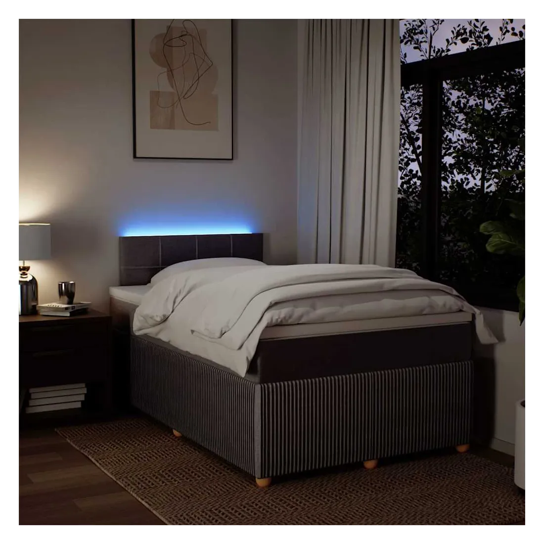 Utilisez ce lit à sommier pour profiter d'une nuit de sommeil réparatrice ! Il vous offre une relaxation maximale et un sommeil agréable. Matériau doux et durable : le tissu en polyester allie douceur, respirabilité et durabilité, vous garantissant un confort et une convivialité ultimes.Matelas à ressorts ensachés : ce matelas à ressorts ensachés comporte des ressorts ensachés individuels qui fonctionnent indépendamment pour offrir un soutien personnalisé en réagissant uniquement à la pression exercée dans chaque zone. Cette conception empêche « l'enroulement » et réduit le transfert de mouvement par rapport aux matelas traditionnels à ressorts ouverts. Chaque ressort ensaché soutient le corps individuellement.Lumières LED pour une ambiance agréable : ce lit est équipé de lumières LED qui peuvent être facilement réglées pour créer un spectacle lumineux personnalisé. Vous pouvez personnaliser les modes, les couleurs et la luminosité pour améliorer l'ambiance de votre espace intérieur.Surmatelas confortable : ce surmatelas améliore le soutien et le confort grâce à sa surface douce et respirante, tout en prolongeant la durée de vie de votre matelas. Sa housse amovible permet un lavage facile, ce qui facilite l'entretien. Bon à savoir :Ce produit est doté d'un connecteur USB qui nécessite une source d'alimentation USB de 5V certifiée (non incluse).Pour des raisons d'hygiène, le matelas ne peut pas être retourné si l'emballage est retiré ou ouvert.Seule la partie avec un symbole de ciseaux peut être coupée et seule la partie avec l'USB continuera à fonctionner comme avant.