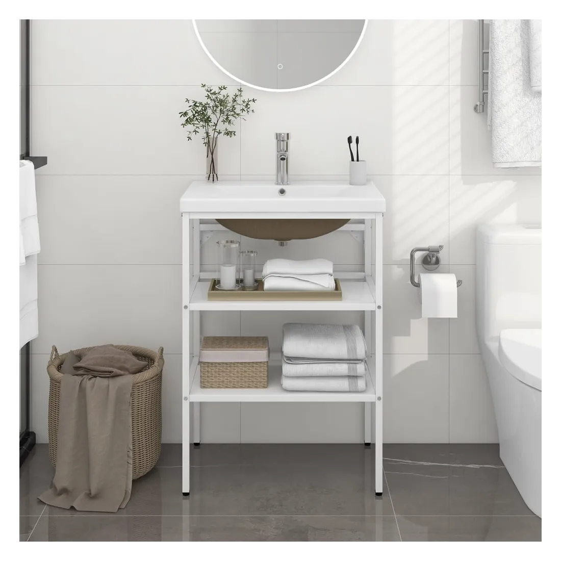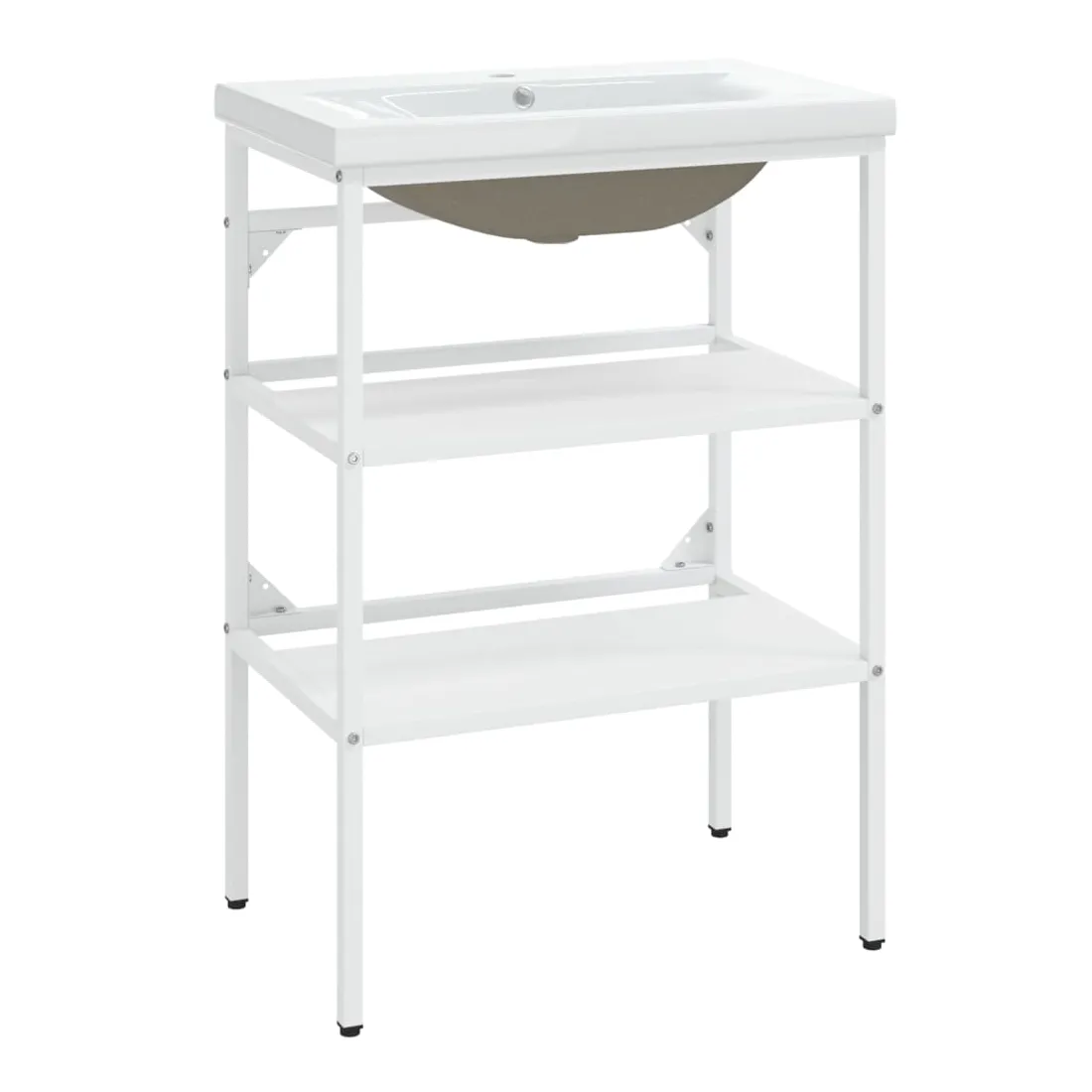Ce cadre de lavabo de salle de bain avec une vasque à encastrer s'intègre parfaitement à votre salle de bain ou à votre salle d'eau, avec un aspect propre et ordonné. Le support de lavage est fabriqué en fer enduit de poudre, ce qui le rend stable et durable. Ce cadre de lavabo permet d'accéder facilement aux serviettes et aux paniers et crée un espace plus vaste qu'un rangement fermé. Fabriqué en céramique, le bassin peut non seulement servir de récipient pour un usage quotidien mais aussi d'ornement dans votre espace de vie. Grâce à son design tendance et contemporain, ce lavabo s'adaptera à tout décor. Un trop-plein est également prévu pour vidanger l'eau lorsque le lavabo est trop plein. Sa surface émaillée lui confère un design moderne et élégant. De plus, le cadre de lavabo et la