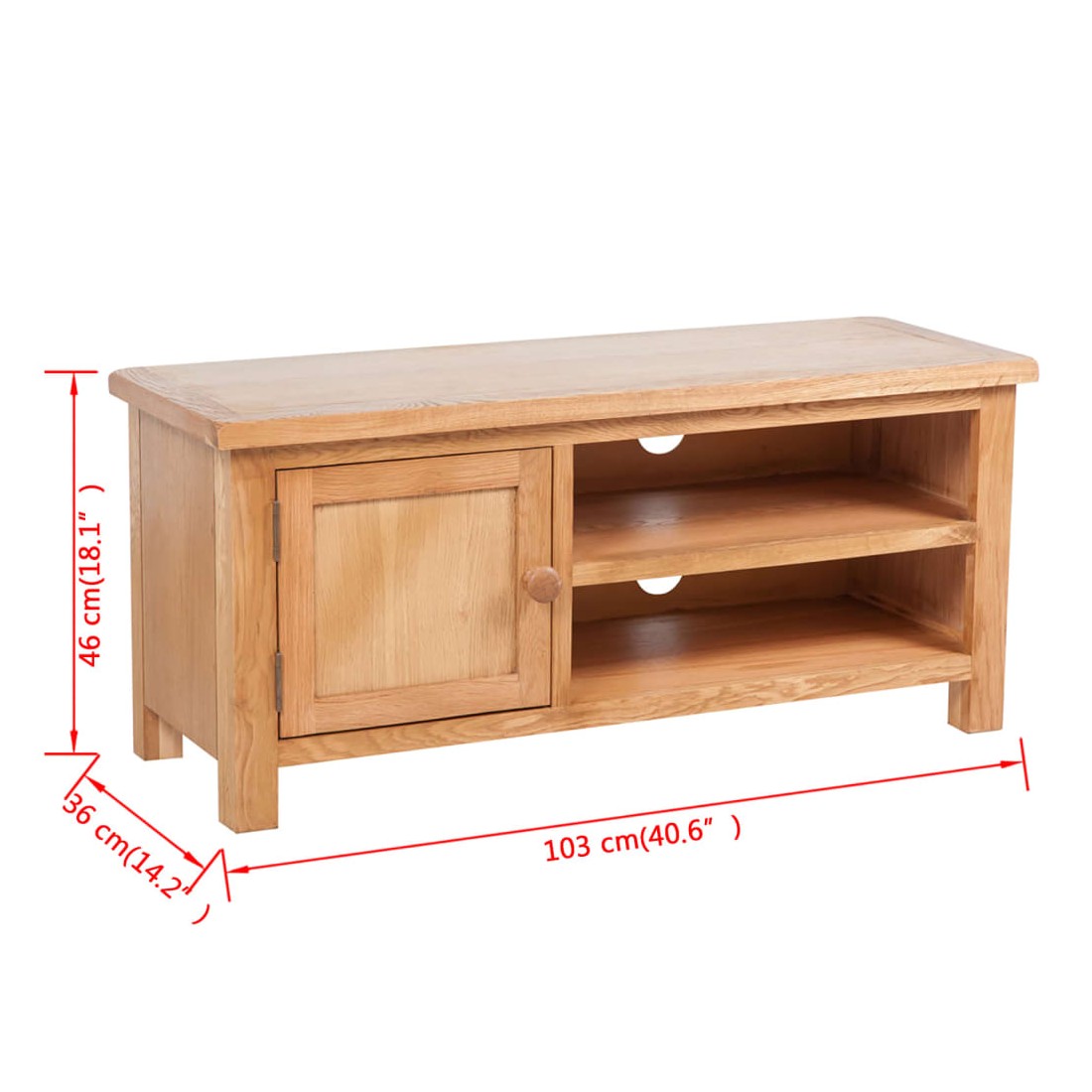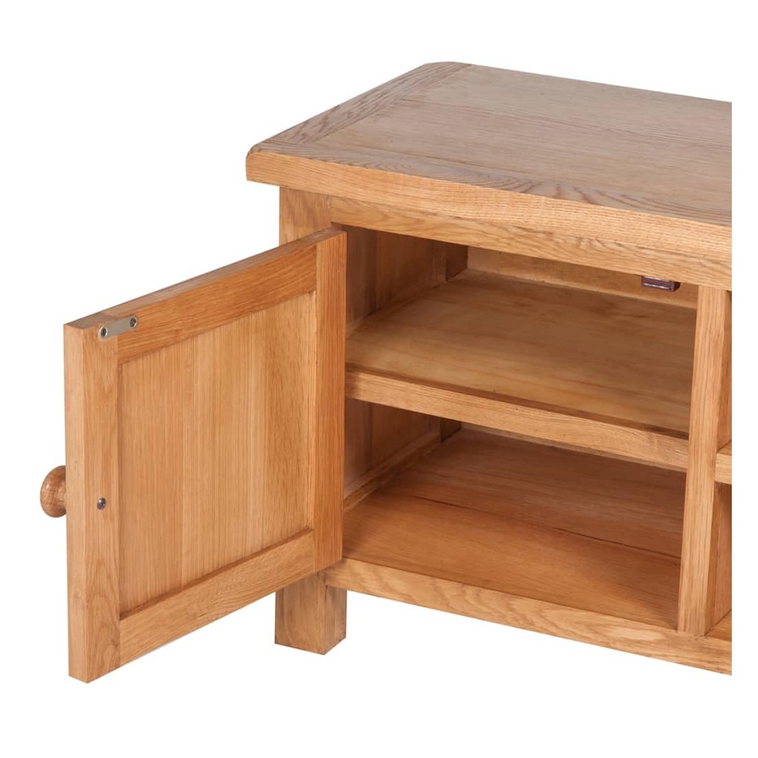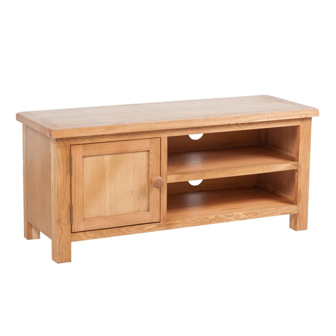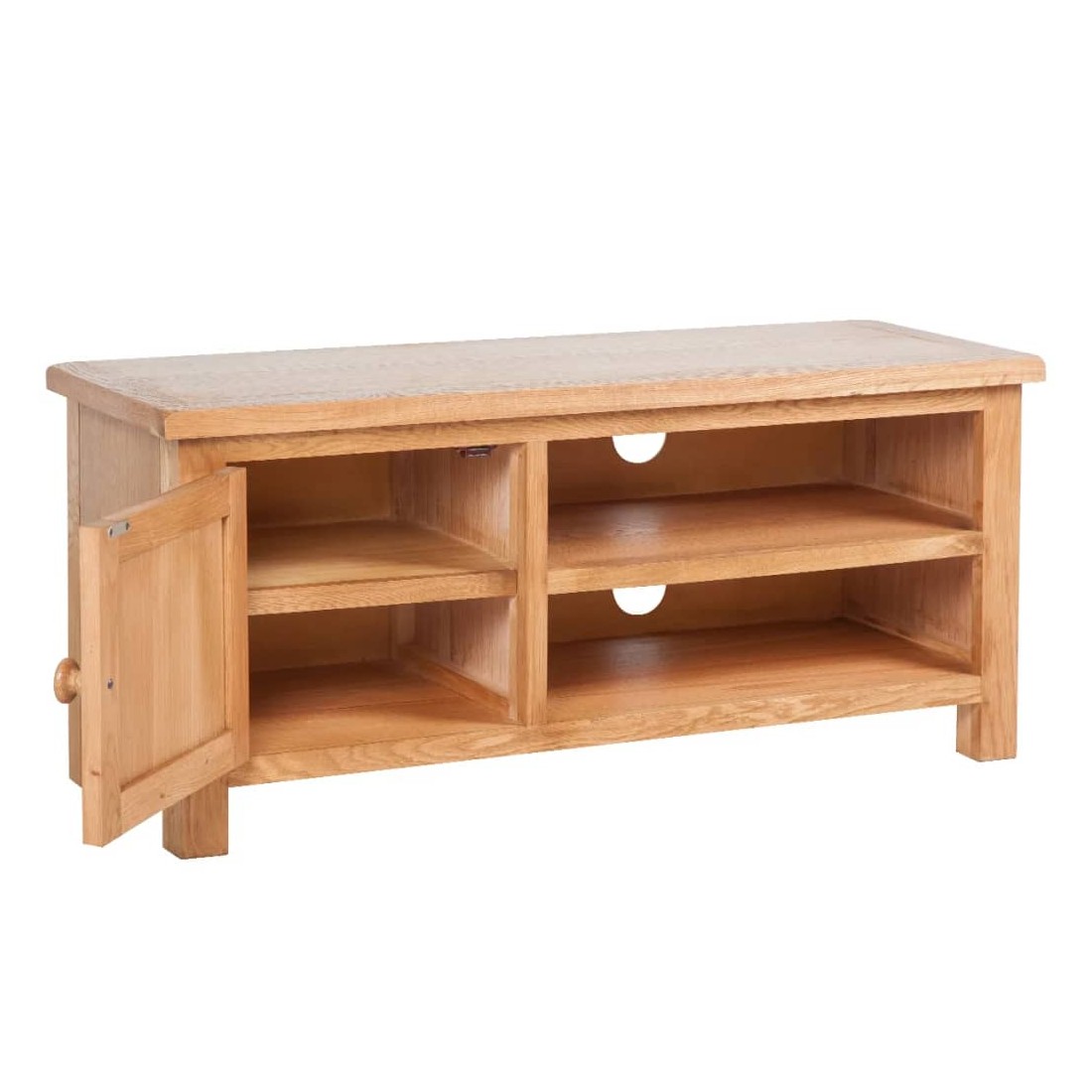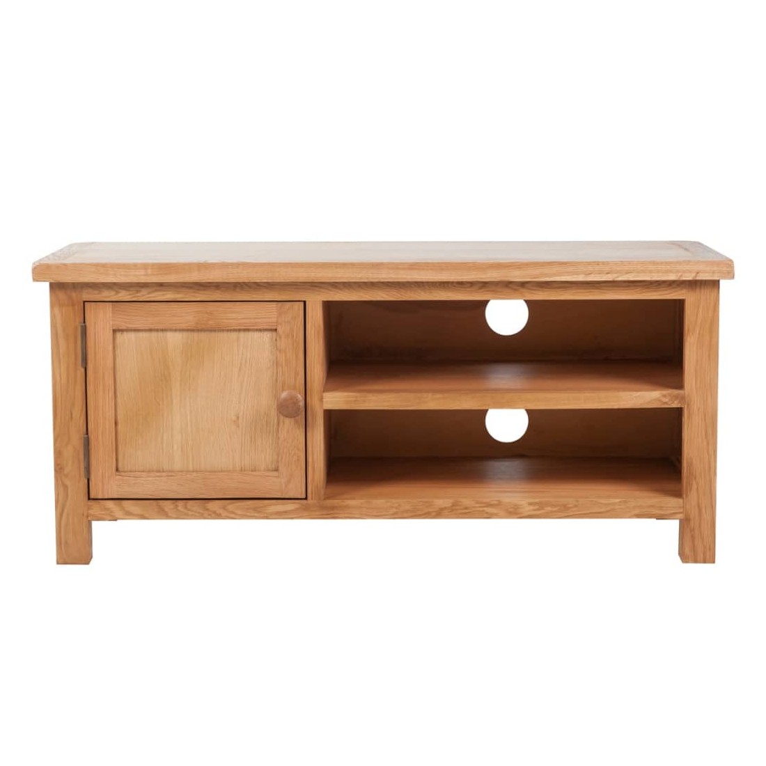 Ce meuble TV en bois de haute qualité a une apparence rustique qui conviendra à toute chambre à coucher ou salon. Ce meuble TV est fabriqué de façon experte en chêne massif durable et hautement fonctionnel. Il comporte un placard avec deux étagères pour les bibelots et deux autres étagères pour les lecteurs multimédia ou les consoles de jeu et les systèmes de son surround. Deux sorties pratiques pour câbles vous permettent de les garder soigneusement hors de la vue.