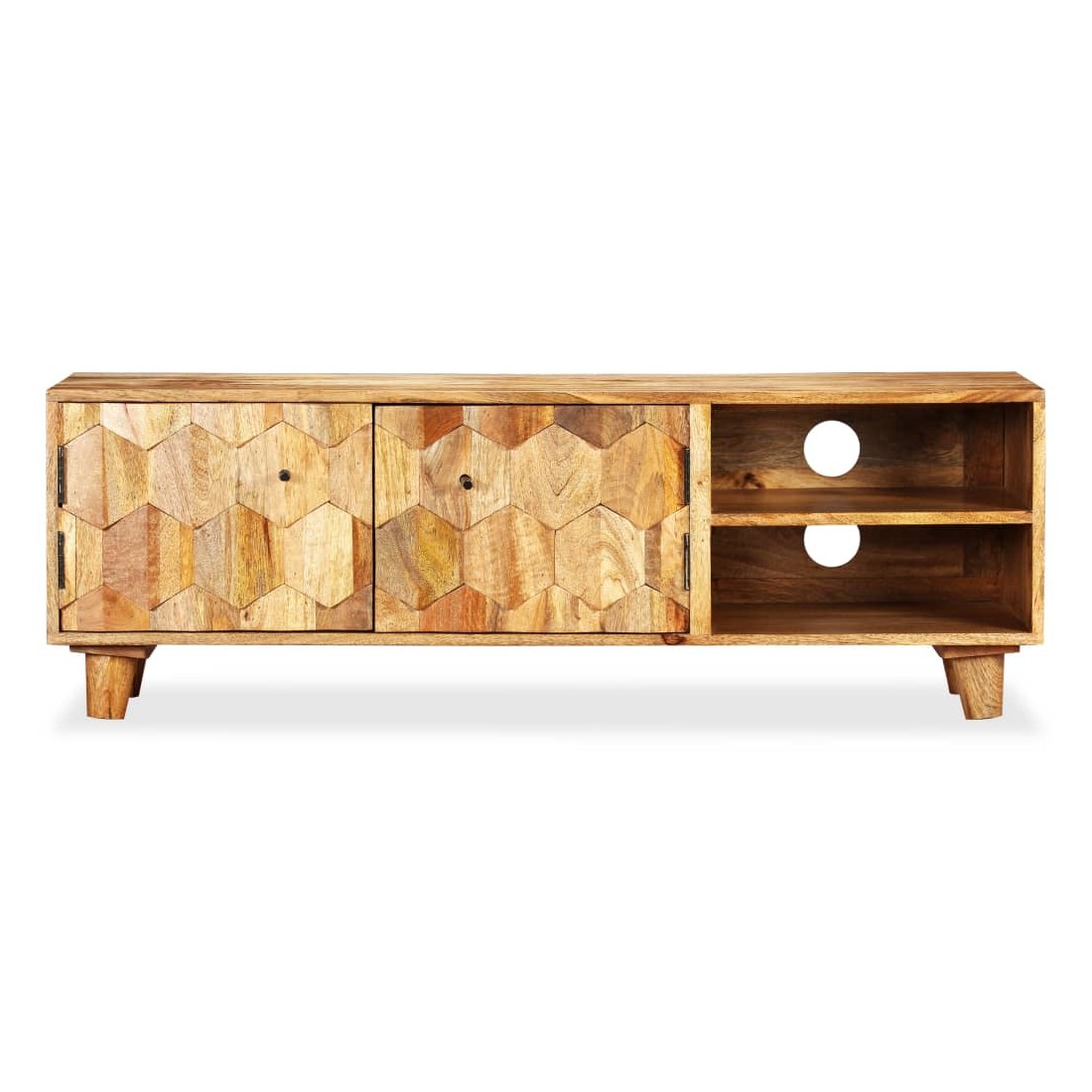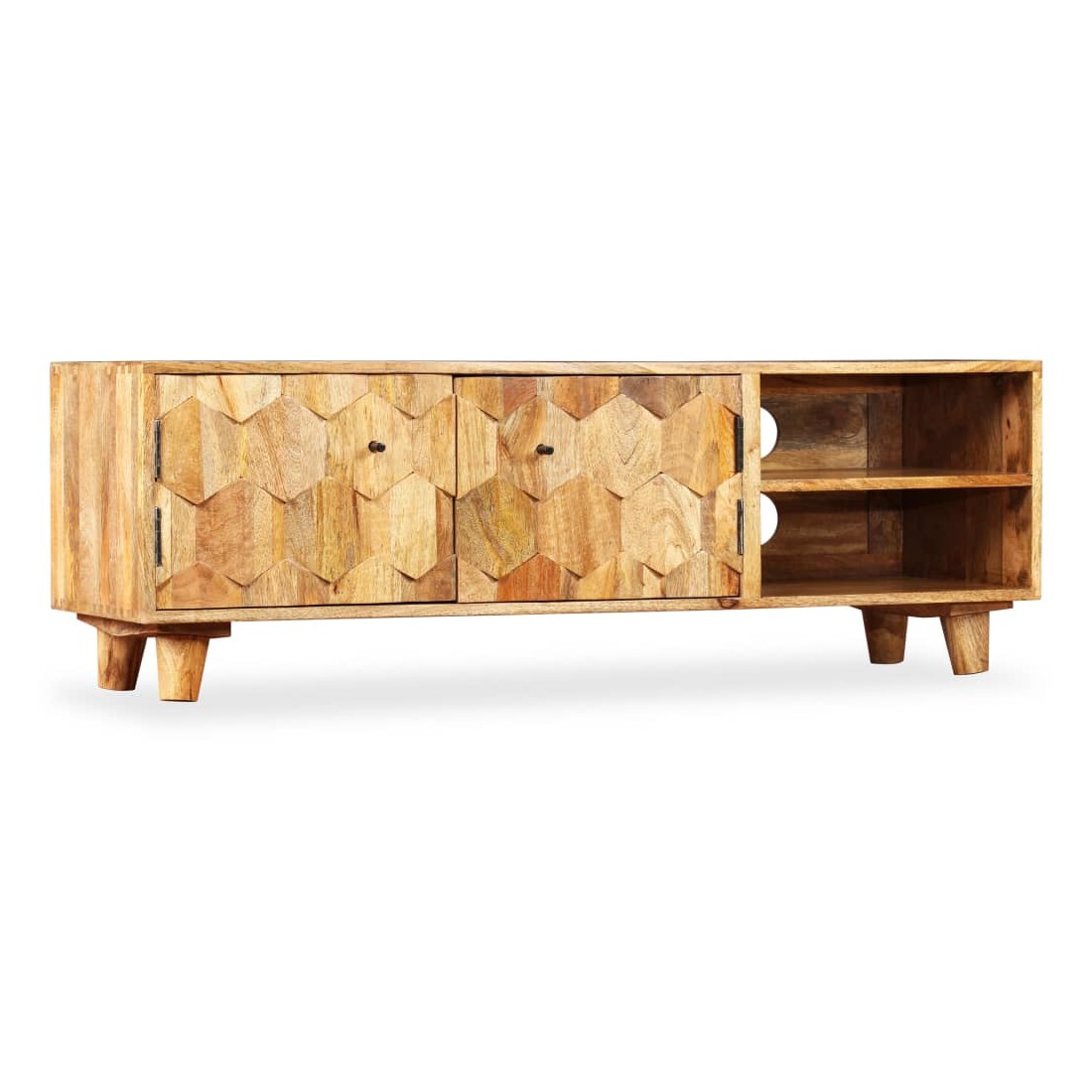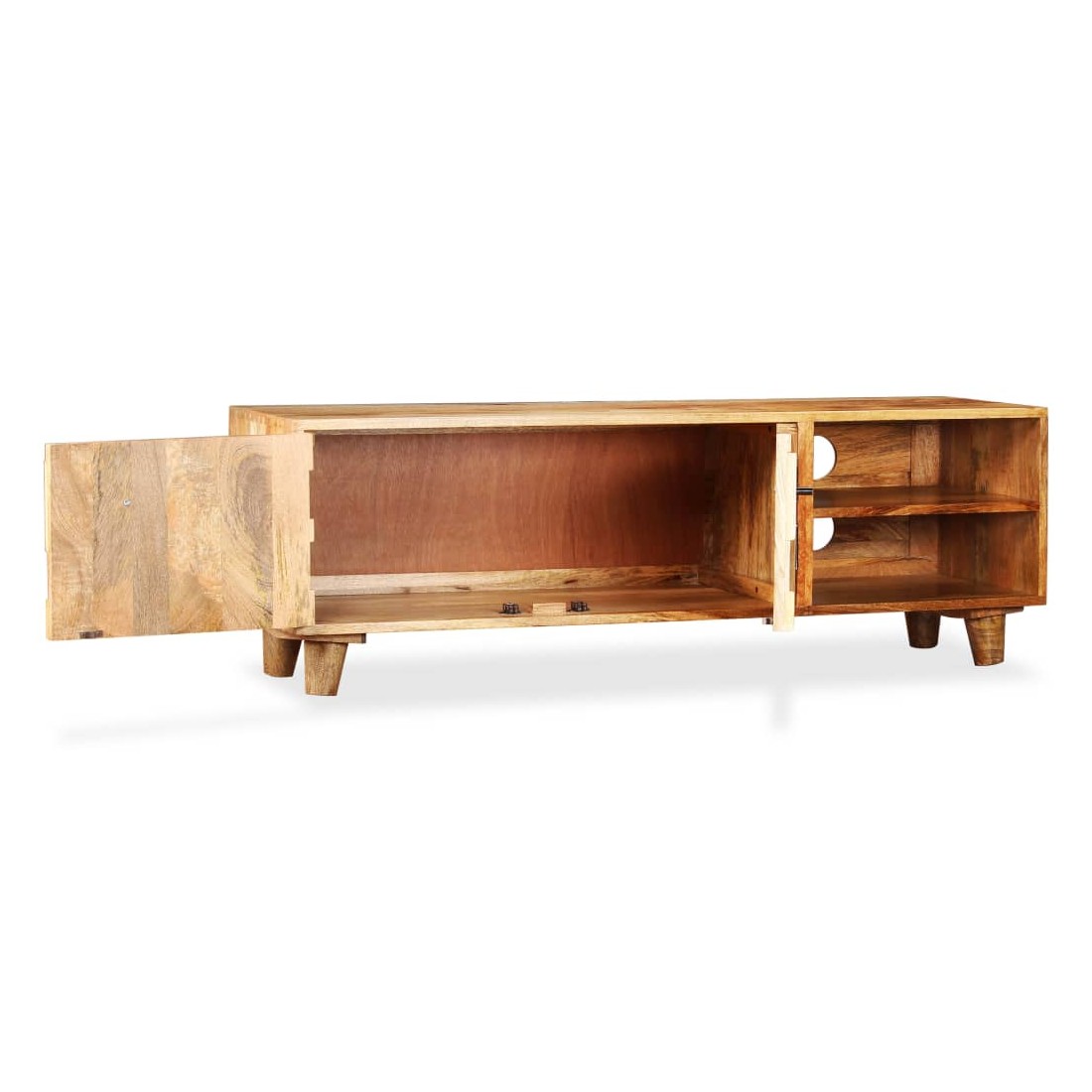 Ce meuble TV solide et robuste en bois, avec un grand espace de rangement, sera un excellent supplément à votre salon. Fabriqué en bois de manguier solide, ce meuble HiFi est stable et durable. Le plateau robuste est idéal pour placer votre téléviseur ou divers objets décoratifs comme des vases, des paniers de fruits ou des plantes en pot. Les grandes armoires et les 2 étagères offrent un espace de rangement suffisant pour garder une variété d'appareils multimédia ou d'autres articles. Chaque étape du processus de construction est réalisée avec le plus grand soin, qu'il s'agisse de recombinaison, de polissage ou de laquage. L'assemblage est facile. Remarque importante : la couleur et les grains de bois peuvent varier d'une pièce à l'autre, ce qui rend chaque pièce unique et légèrement