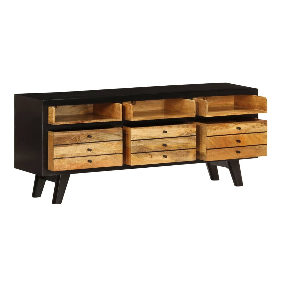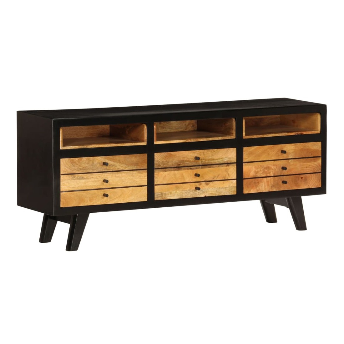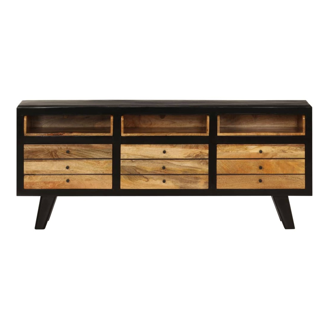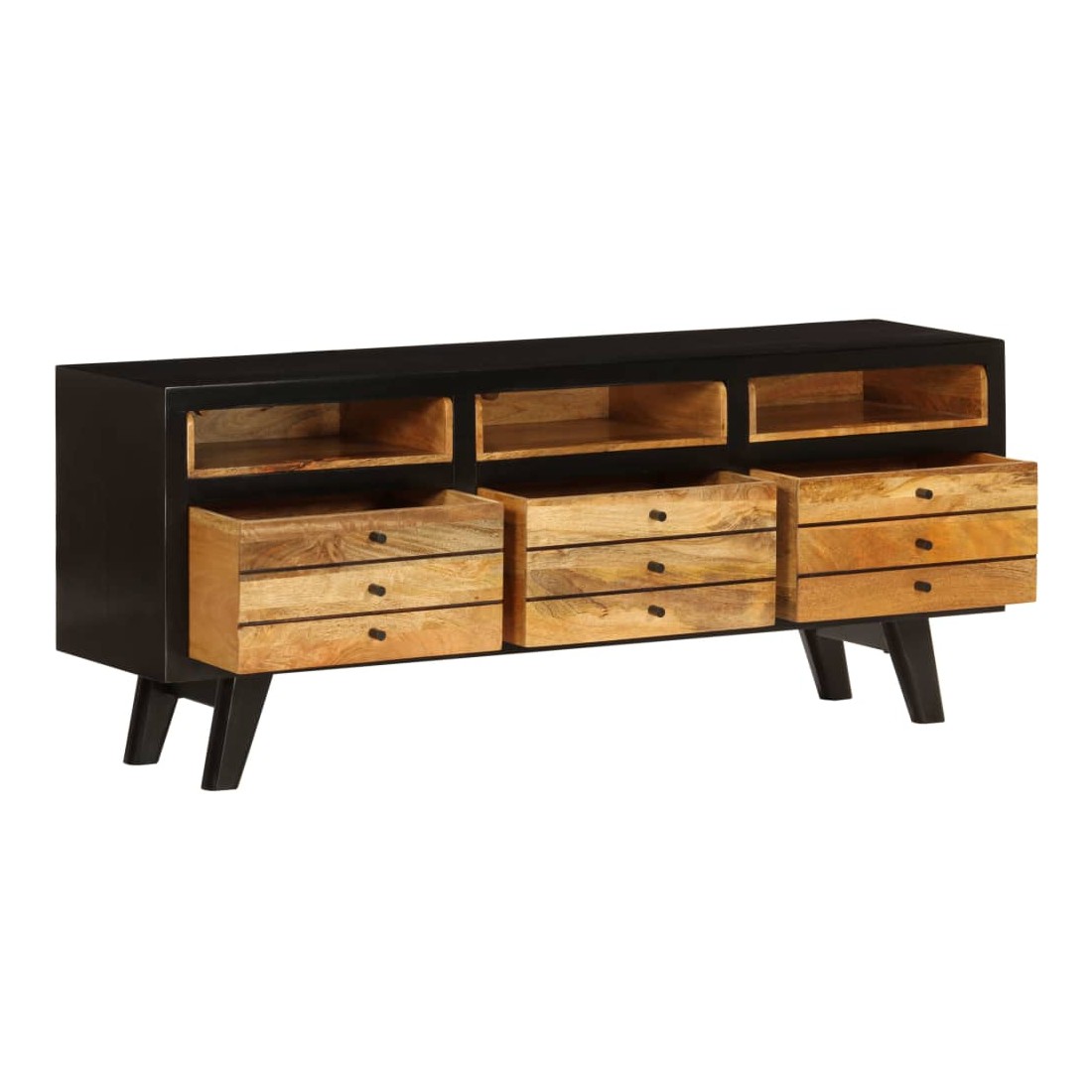 Ce meuble TV de style rétro deviendra le point de mire de votre salon ou de votre espace de divertissement. Il peut également être utilisé comme buffet, armoire latérale, etc. Le meuble TV est fait à la main en bois de manguier massif qui est solide, stable, durable et magnifique et la qualité de l'artisanat s'ajoute à son style rétro spectaculaire. Chaque étape du processus est réalisée avec le plus grand soin, que ce soit le polissage, la peinture ou le laquage. La qualité de l'artisanat et les beaux grains de bois rendent chaque meuble unique et légèrement différent l'un de l'autre. Les 3 compartiments et les 3 tiroirs vous offrent suffisamment d'espace pour ranger votre lecteur DVD, console de jeux, appareil de streaming et vos supports multimédia. L'armoire est facile à assembler. Remarque importante : les couleurs varient d'une pièce à l'autre, rendant chacun de nos meubles TV unique. La livraison est aléatoire, ce qui garantit l'exclusivité et l'individualité de votre produit.