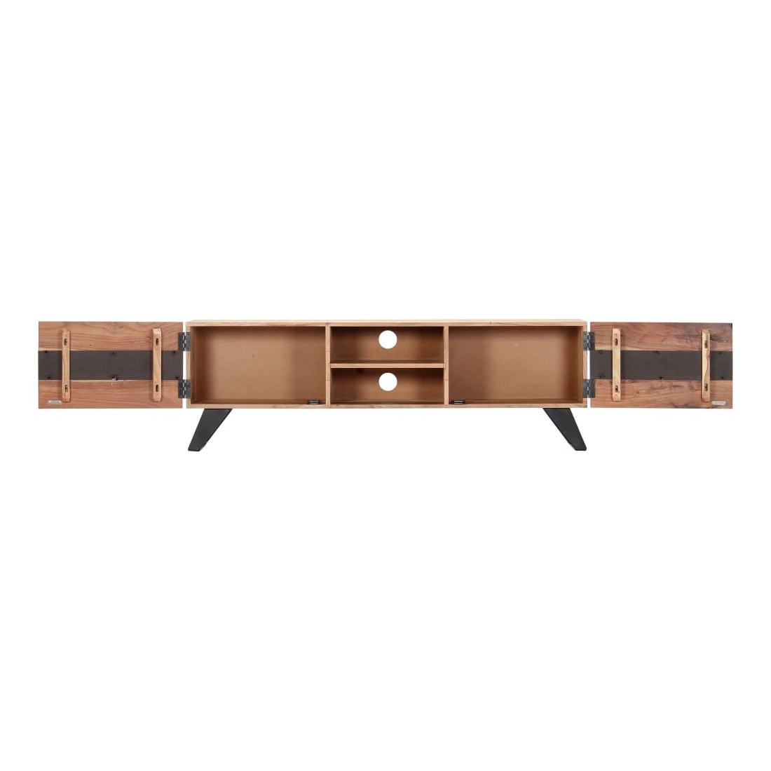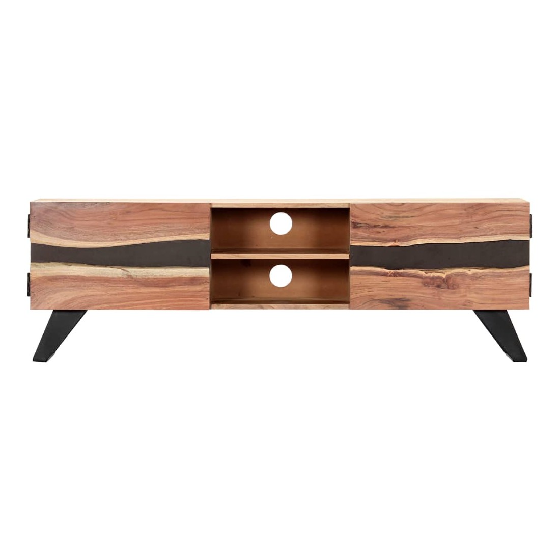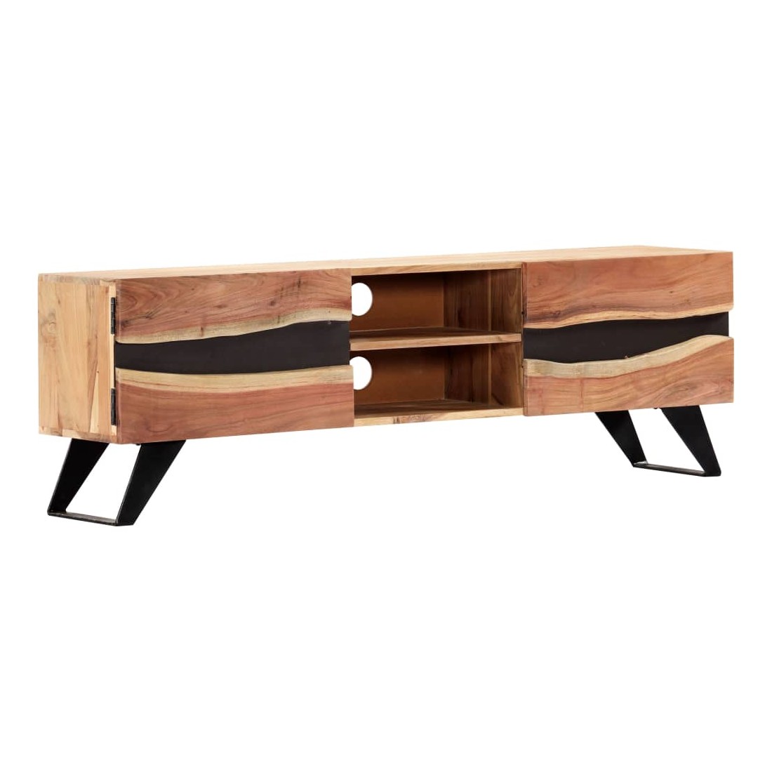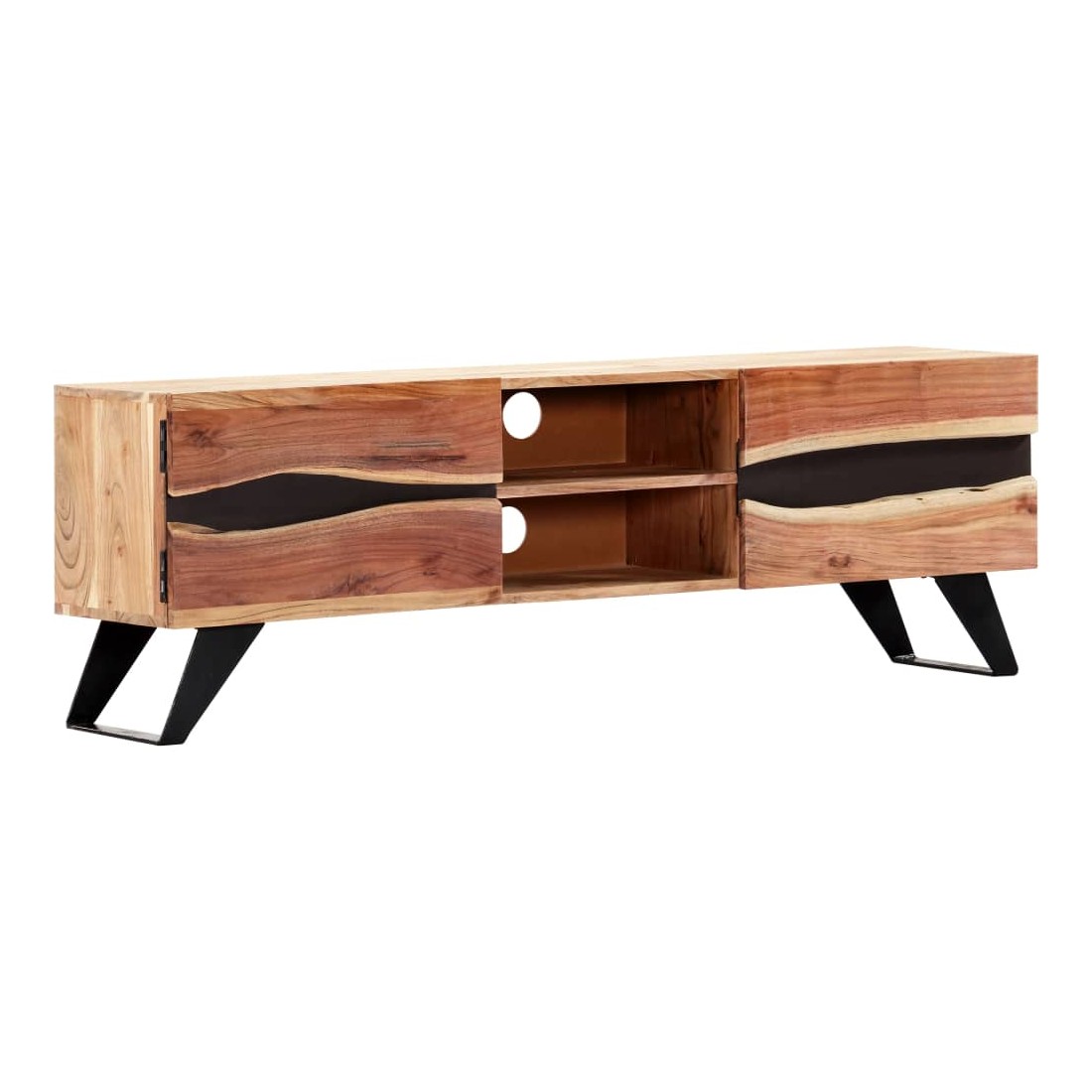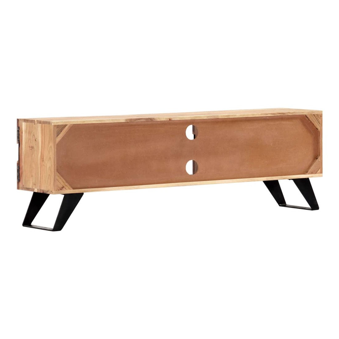 Ce meuble de télévision dégage un charme rustique. Il deviendra une pièce de résistance de votre intérieur. Le buffet est en bois massif d'acacia qui a reçu une finition naturelle pour lui donner un bel aspect. En conséquence, ce buffet bas au design soigné est extrêmement stable, durable et esthétique. De plus, cette armoire en bois est entièrement fabriquée à la main et les gracieux grains de bois permettent à chaque meuble de se distinguer et de se différencier légèrement l'un de l'autre. Cette armoire HiFi comporte 2 compartiments et 2 armoires avec portes, offrant un espace confortable pour ranger vos appareils multimédia, livres, chaussures, ainsi que divers autres articles. Remarque importante : les grains de bois varient d'une pièce à l'autre, rendant chaque pièce unique. La li