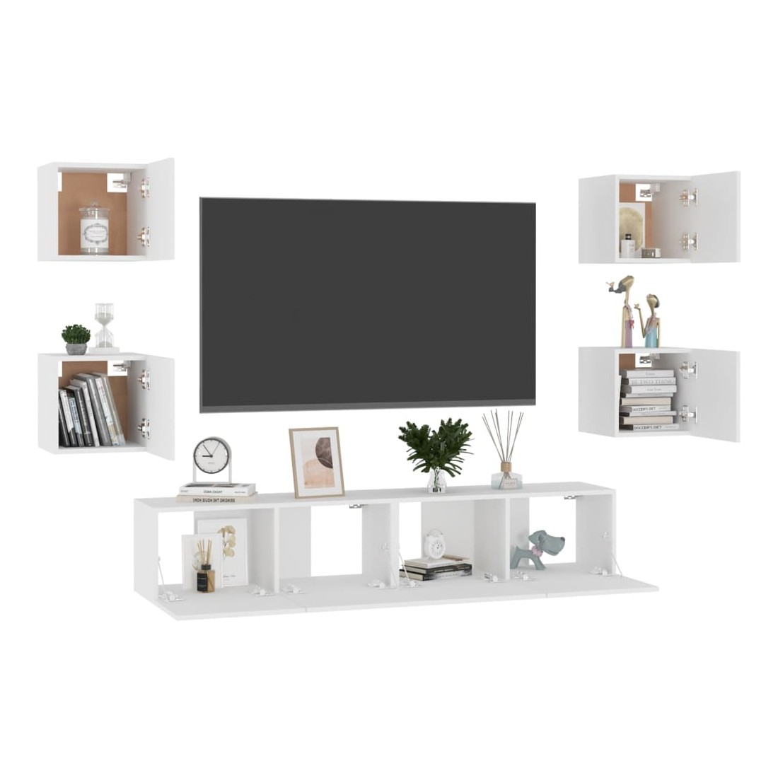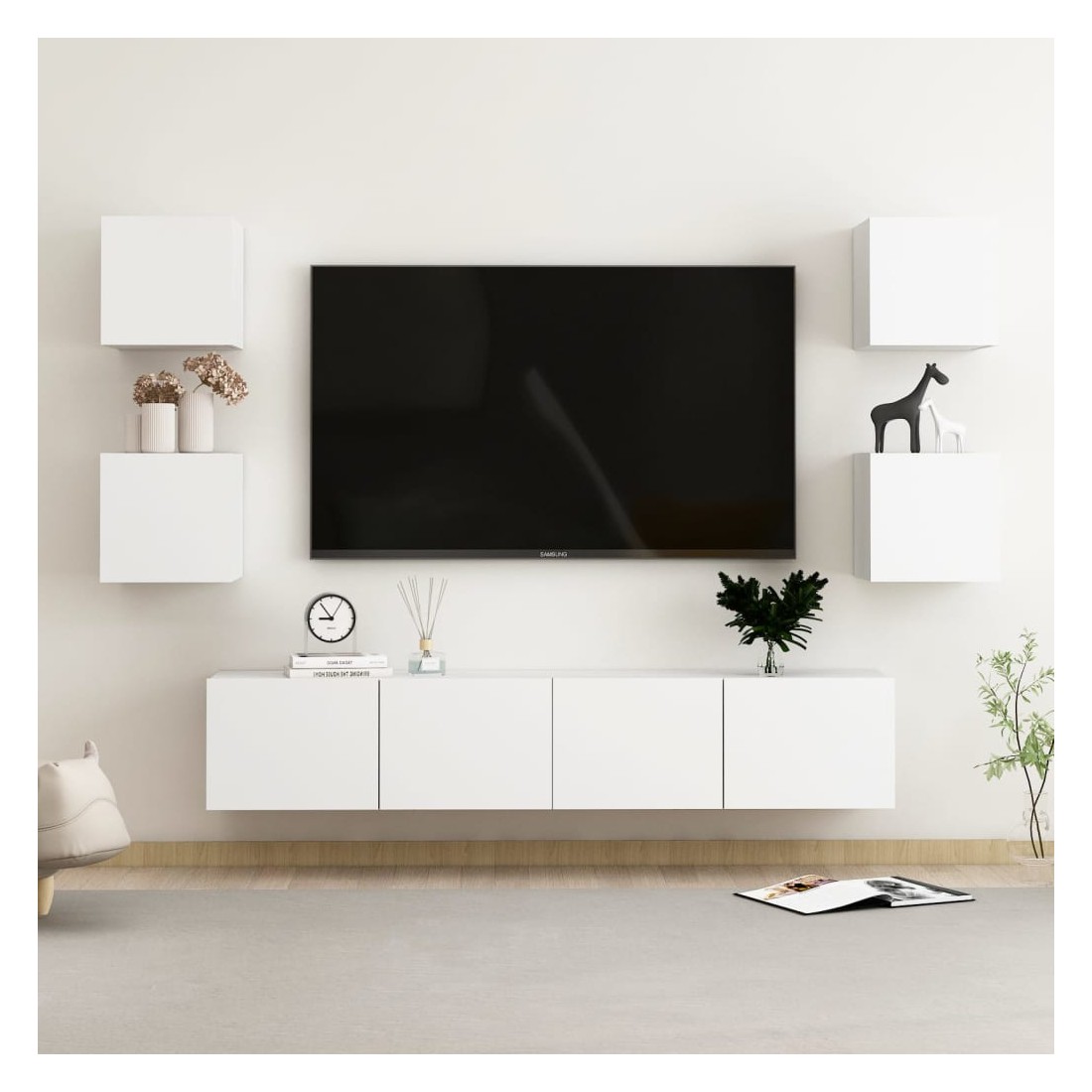 Cet ensemble de meuble TV robuste est destiné à être le point de mire de votre pièce avec un design à la fois tendance et pratique. Le meuble TV est fixé au mur, ce qui en fait un supplément intemporel à votre maison. Il offre de nombreux compartiments de rangement, ce qui en fait un endroit idéal pour stocker tous vos livres, magazines, DVD ou autres objets. Le meuble stéréo est facile à entretenir et à nettoyer avec un chiffon humide.