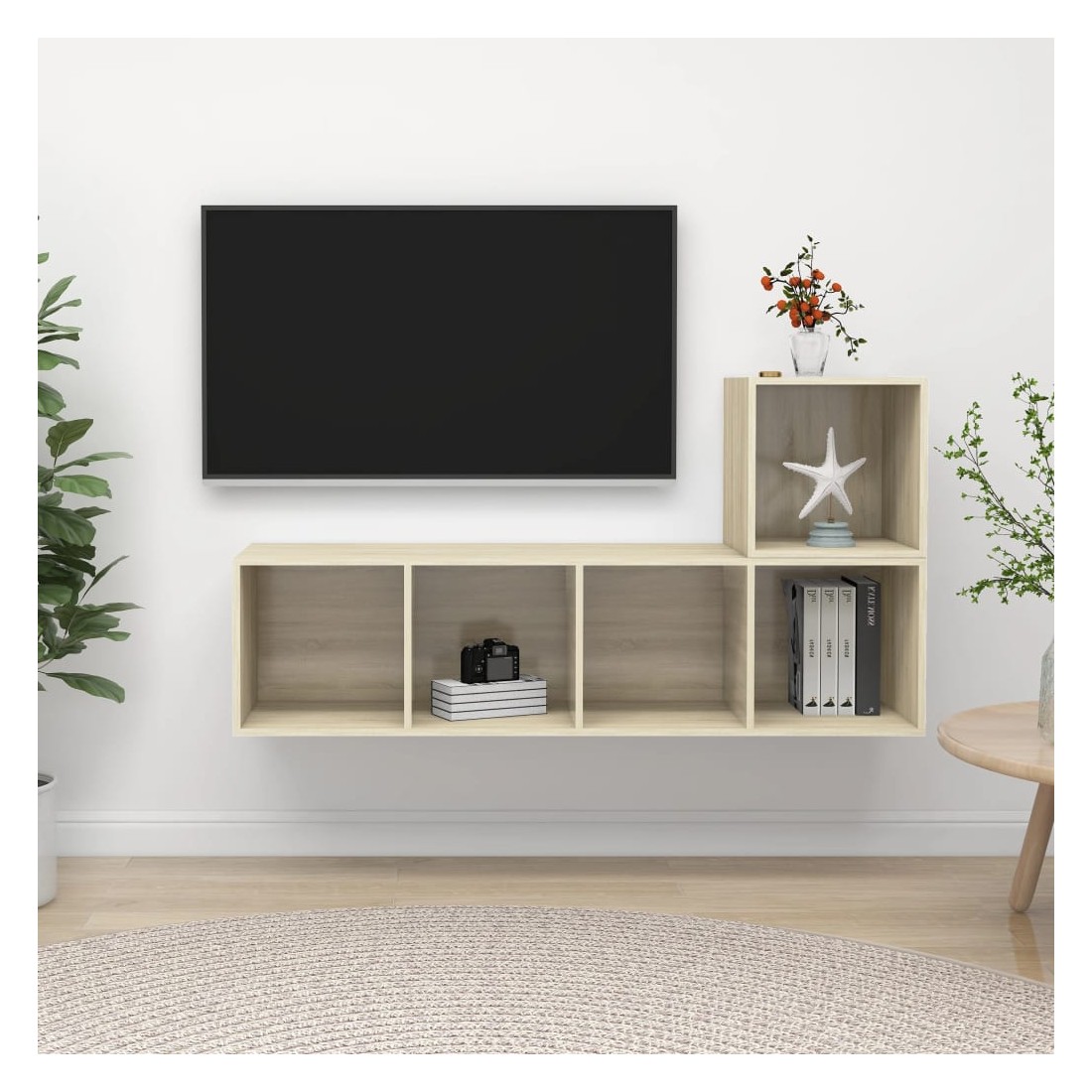 Équipé d'un grand espace de rangement pour organiser divers articles, cet ensemble de meuble TV suspendu sera certainement un supplément pratique et accrocheur dans votre maison. Le meuble TV est fixé au mur, ce qui en fait un supplément intemporel à votre maison. Cet ensemble d’armoire HiFi est idéal pour afficher ou garder bien organisés ou à portée de main tous les articles préférés. De plus, l’ensemble d’armoire stéréo est facile à nettoyer avec un chiffon humide.