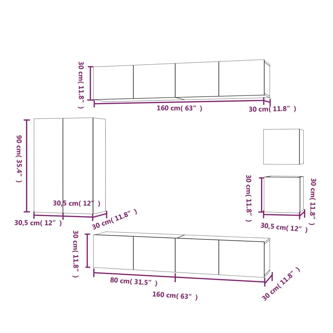 • 4 x meuble TV : 80 x 30 x 30 cm (L x l x H)