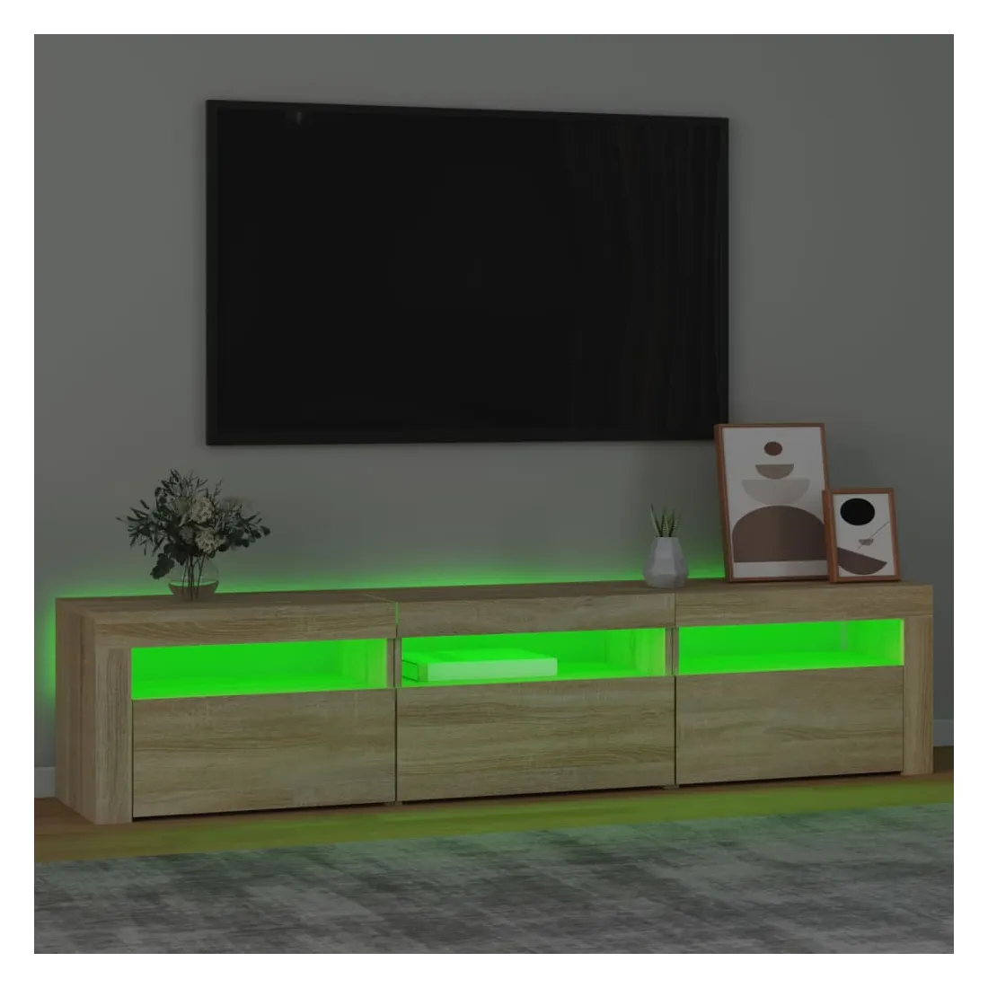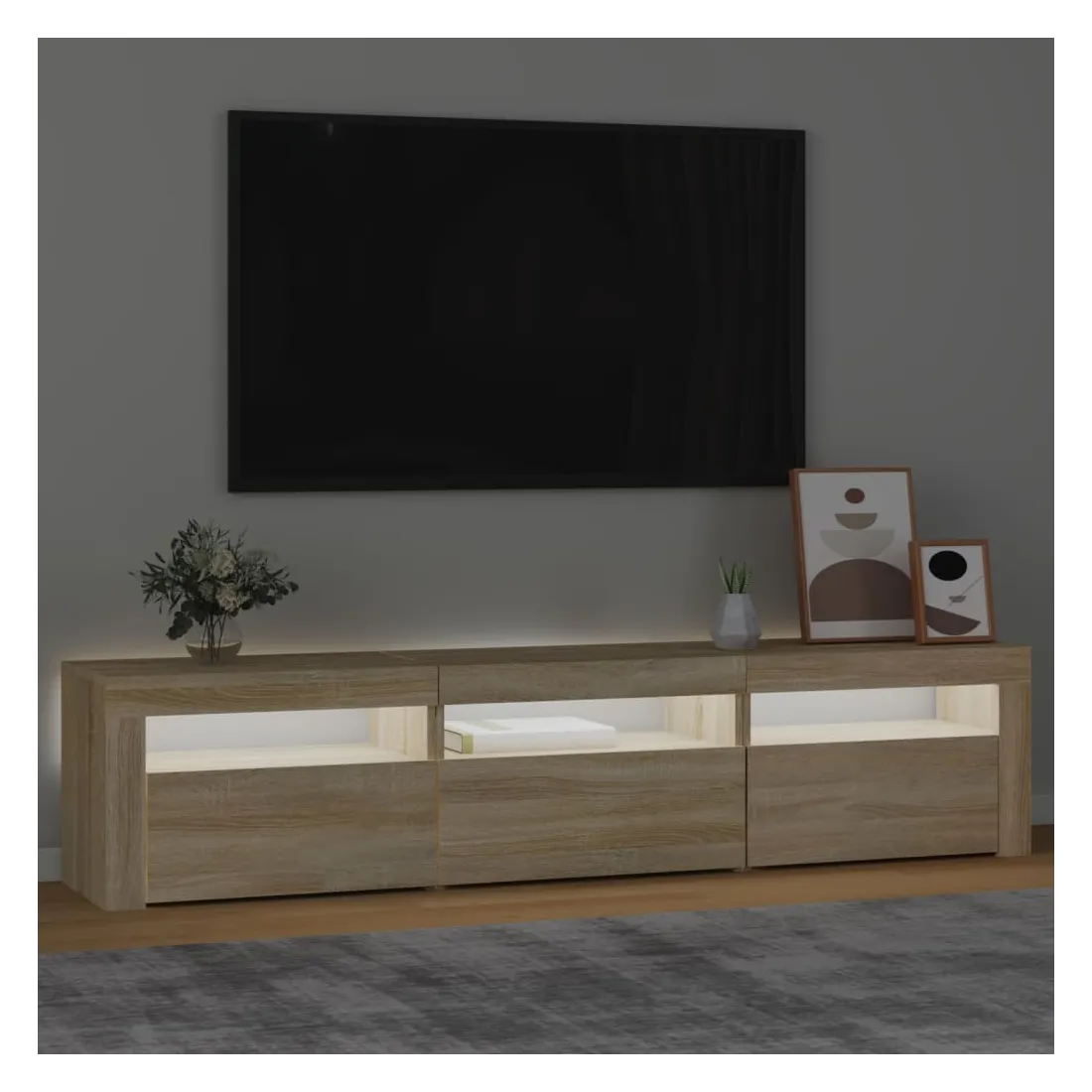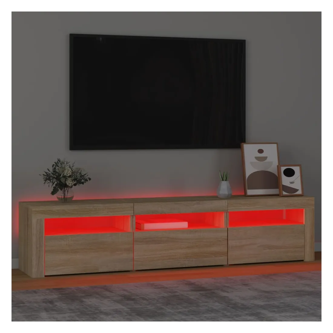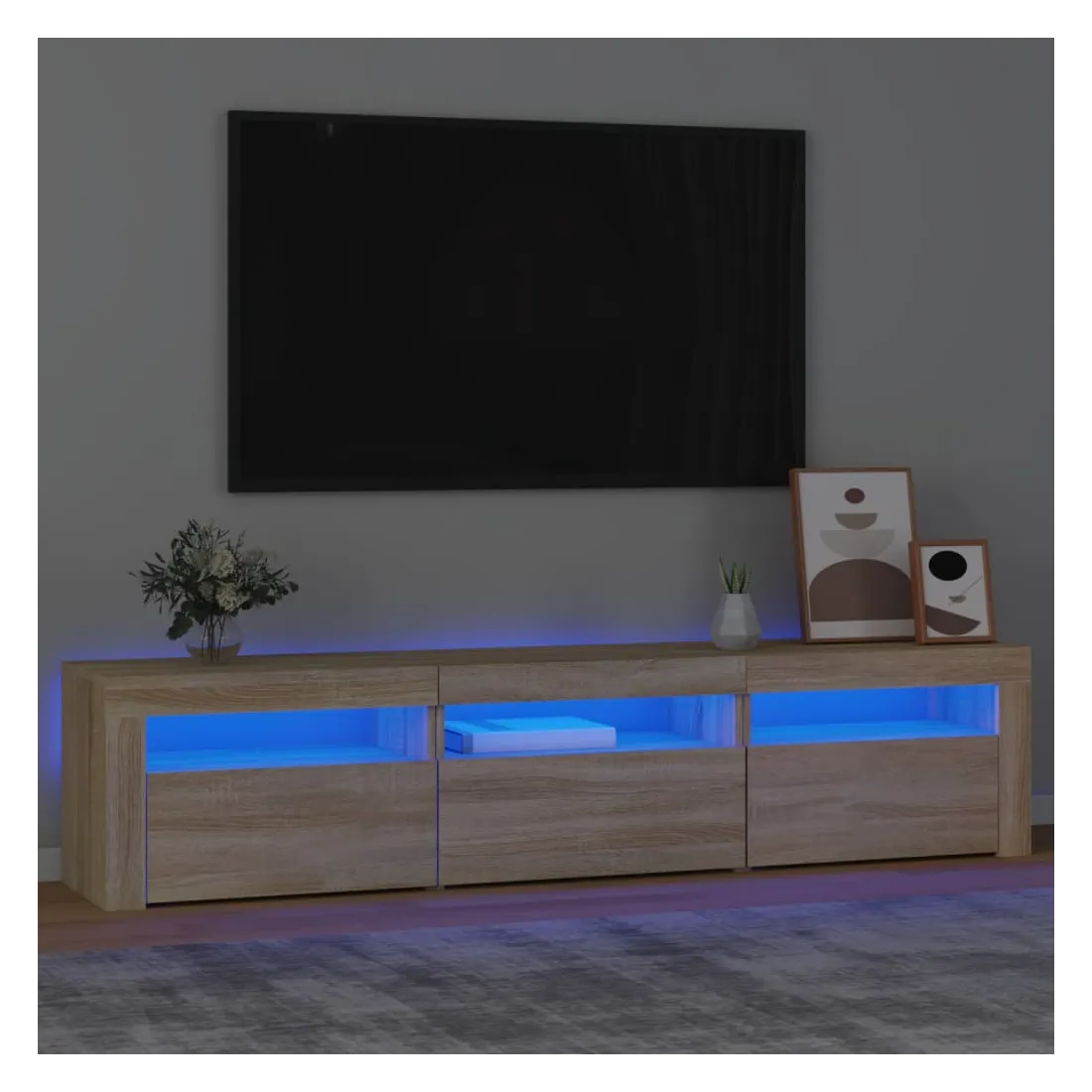 Avec un design à la fois tendance et pratique, ce meuble TV avec éclairage LED deviendra certainement un point central de votre pièce. Matériau pratique : le bois d'ingénierie est d'une qualité exceptionnelle avec une surface lisse et présente également résistance, stabilité et résistance à l'humidité. Lumières LED colorées : le meuble TV est doté de lumières LED RVB, qui ont différents menus pour changer la couleur des lumières et laisser la couleur s'ajuster automatiquement. Les lumières LED soulignent l'aspect moderne et contribuent à la sensation de tendance.Grand espace de rangement : le meuble TV offre un grand espace de rangement pour garder vos magazines, livres, télécommandes et autres petits objets bien organisés et à portée de main.Fonction d'affichage : le dessus robuste du meuble média est idéal pour exposer des objets décoratifs, des cadres photo et des plantes en pot. Remarque :Ce produit est doté d'un connecteur USB, mais la source d'alimentation certifiée de USB 5V n'est pas incluse.Chaque produit est livré avec un manuel de montage dans la boîte pour un montage facile.
