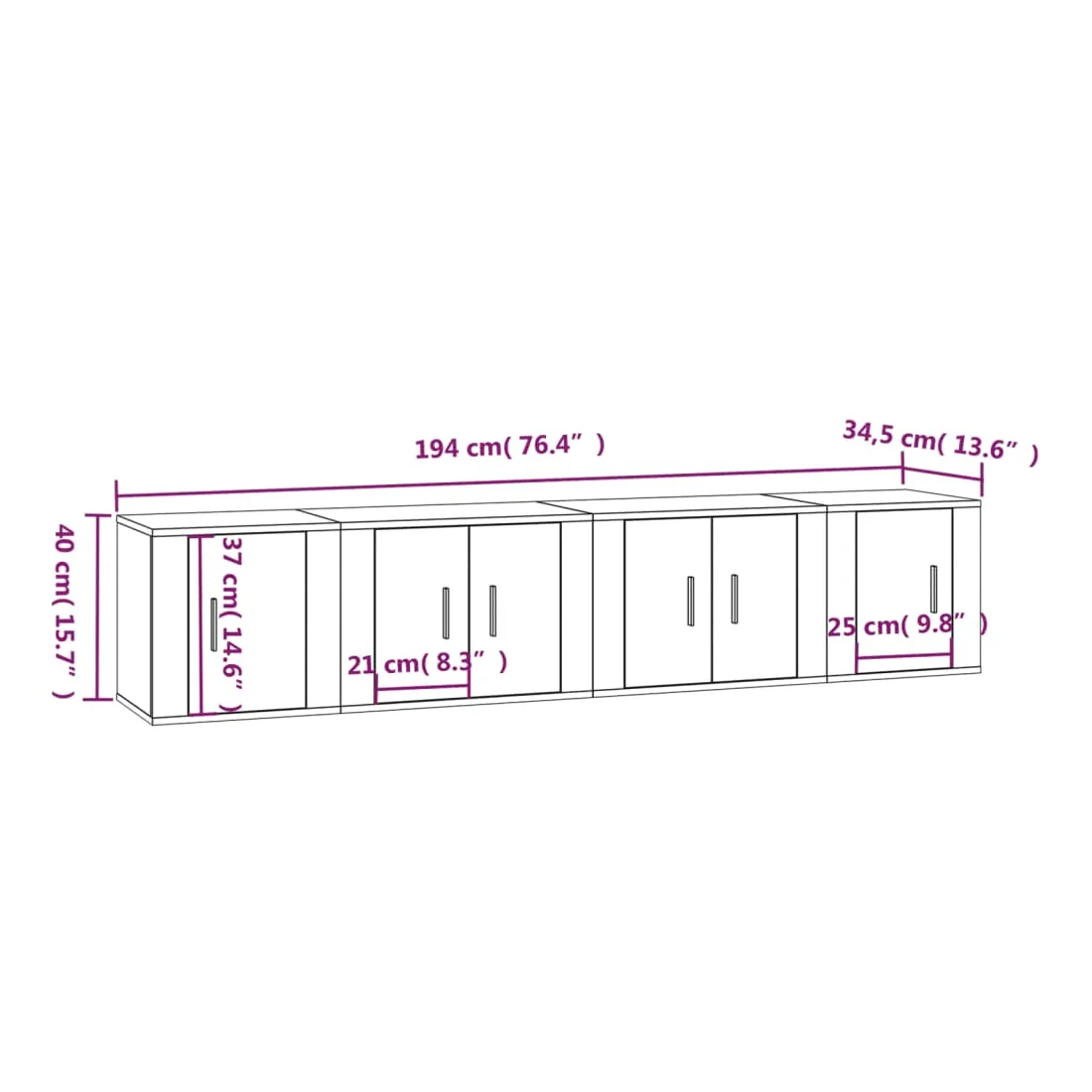 vidaXLCet ensemble de meubles TV classique est conçu pour être le point central de votre pièce, avec un design à la fois tendance et pratique. Matériau robuste : le bois d'ingénierie est d'une qualité exceptionnelle avec une surface lisse et présente également résistance, stabilité et résistance à l'humidité. Fabriqués en bois d'ingénierie, ces meubles TV sont faciles à nettoyer.Grand espace de rangement : ces meubles TV offrent un grand espace de rangement pour garder tous vos magazines, DVD et autres articles bien organisés.Fonction murale : ces armoires multimédias ne prennent pas de place au sol. Vous pouvez facilement les accrocher au mur.Portes pratique : gardez vos essentiels à l'abri de la poussière en les cachant derrière les portes des meubles multimédia. Bon à savoir :Pour faciliter au maximum le montage, chaque produit est livré avec des instructions.Les vis et les chevilles pour l'intérieur du mur ne sont pas incluses. Nous vous conseillons de trouver et d'utiliser des vis et des chevilles adaptées spécifiquement à vos murs. Si vous n'êtes pas sûr, vous pouvez consulter un professionnel. Veuillez lire et suivre chaque étape des instructions.