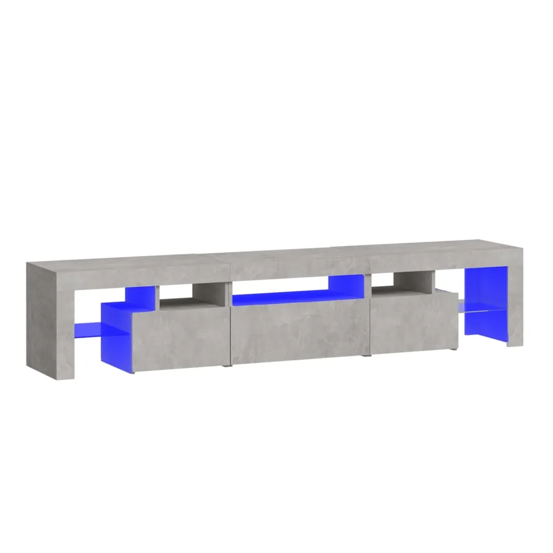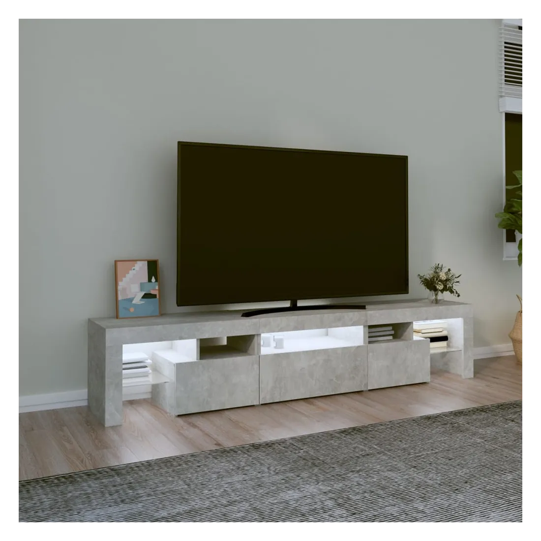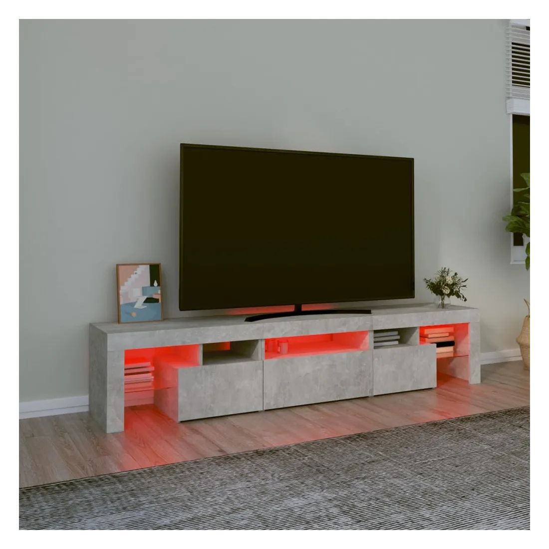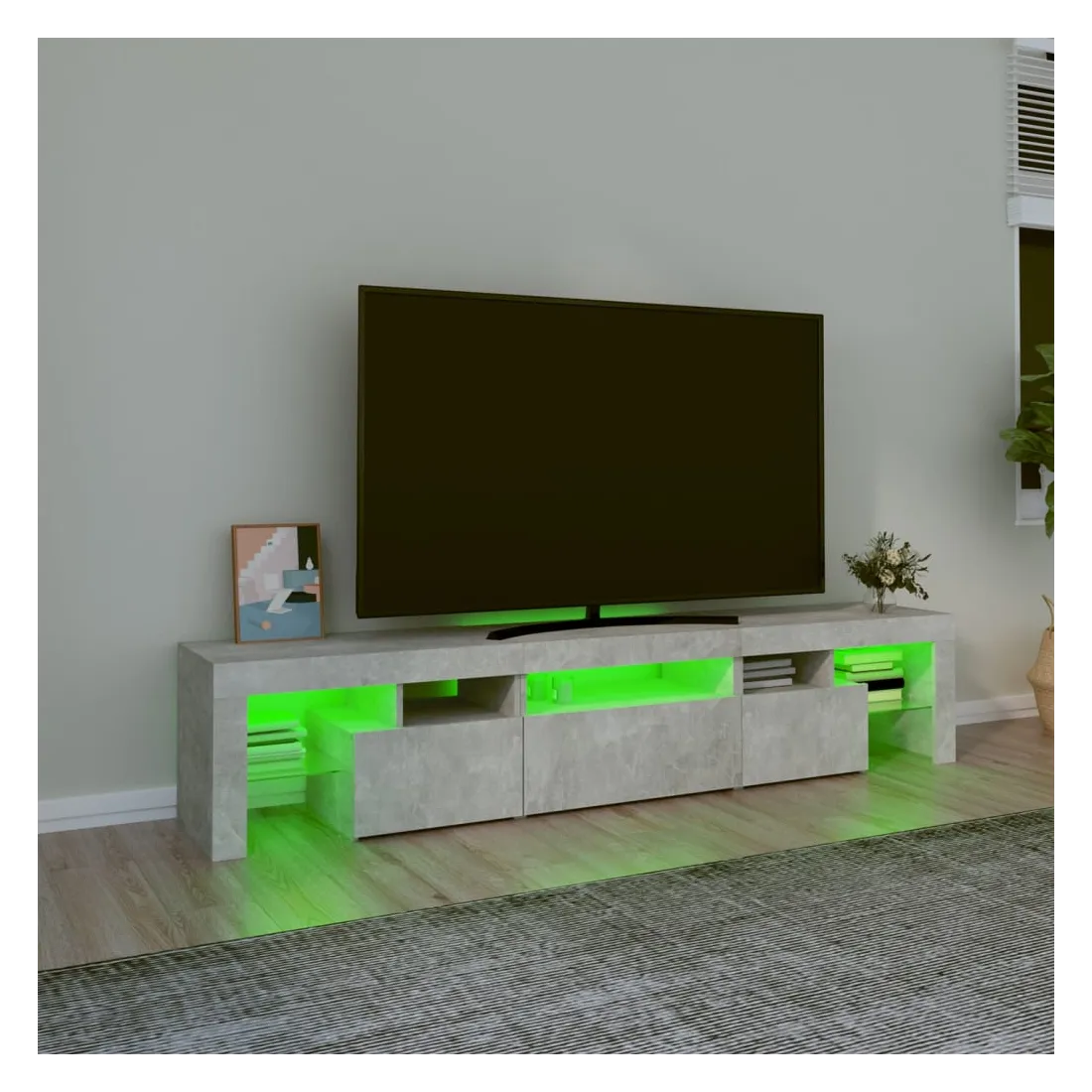 Avec un design à la fois tendance et pratique, ce meuble TV avec éclairage LED deviendra certainement un point central de votre pièce. Matériau pratique : le bois d'ingénierie est d'une qualité exceptionnelle avec une surface lisse et présente également résistance, stabilité et résistance à l'humidité. Lumières LED colorées : le meuble TV est doté de lumières LED RVB, qui ont différents menus pour changer la couleur des lumières et laisser la couleur s'ajuster automatiquement. Les lumières LED soulignent l'aspect moderne et contribuent à la sensation de tendance.Grand espace de rangement : le meuble TV offre un grand espace de rangement pour garder vos magazines, livres, télécommandes et autres petits objets bien organisés et à portée de main.Fonction d'affichage : le dessus robuste du meuble média est idéal pour exposer des objets décoratifs, des cadres photo et des plantes en pot. Remarque :Ce produit est doté d'un connecteur USB, mais la source d'alimentation certifiée de USB 5V n'est pas incluse.Chaque produit est livré avec un manuel de montage dans la boîte pour un montage facile.