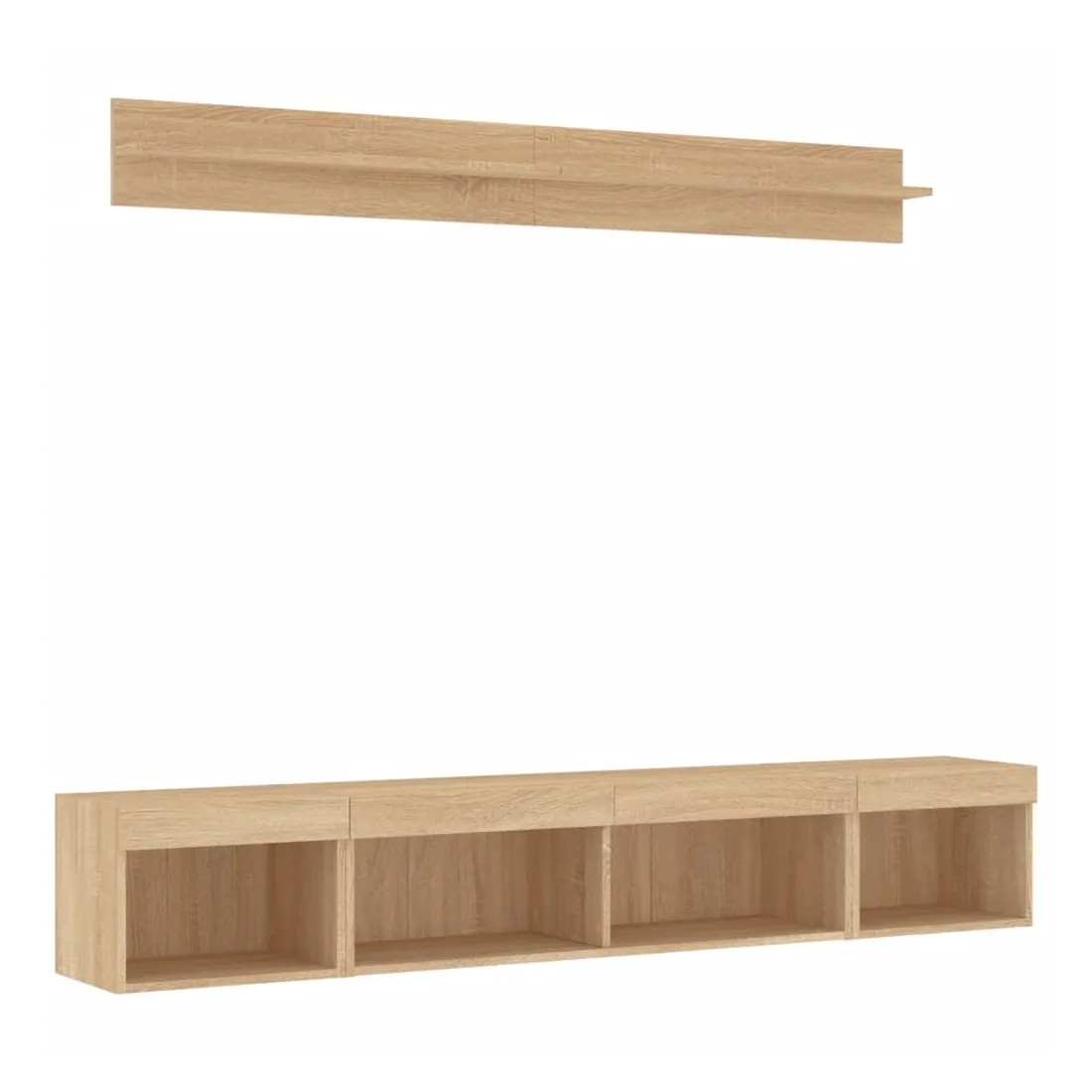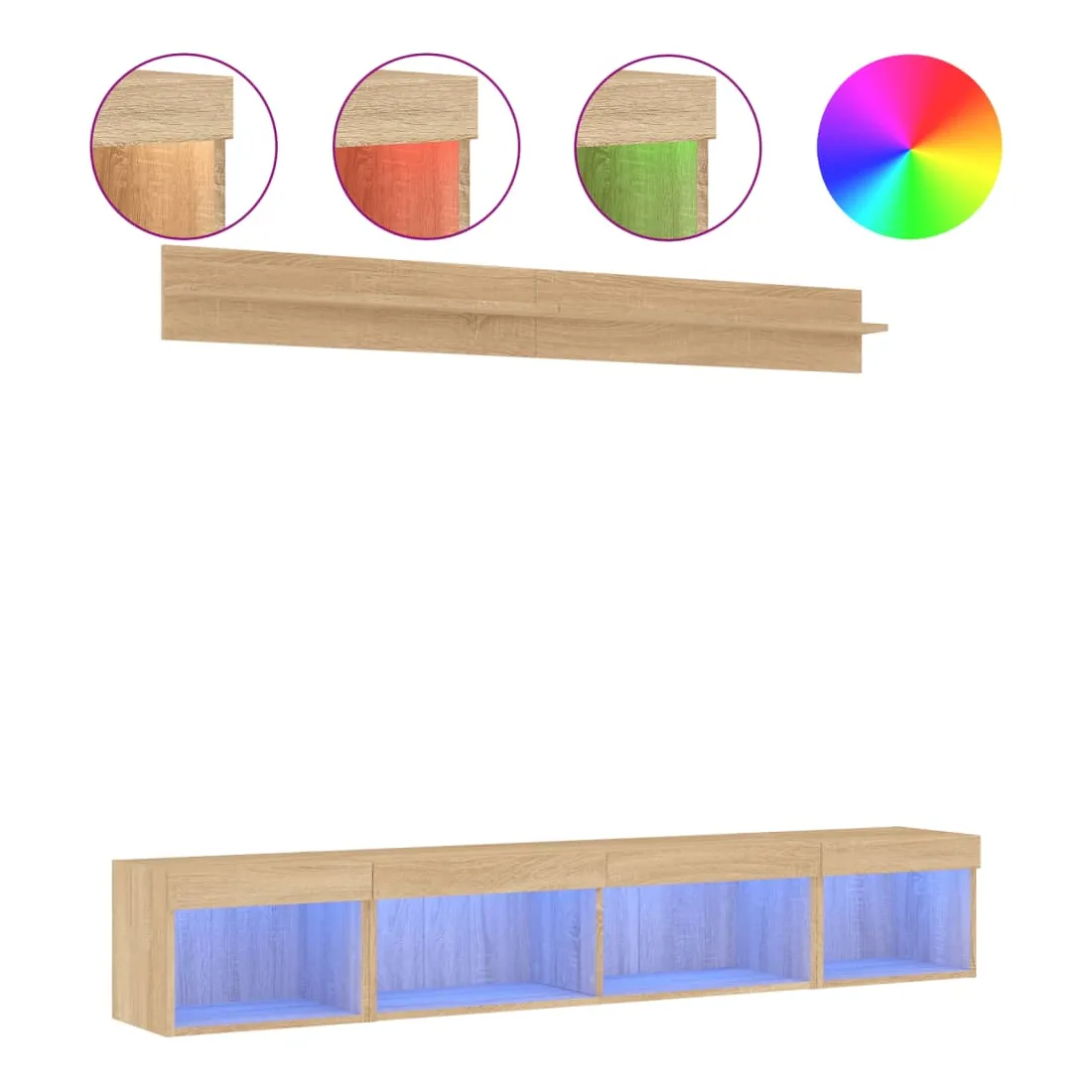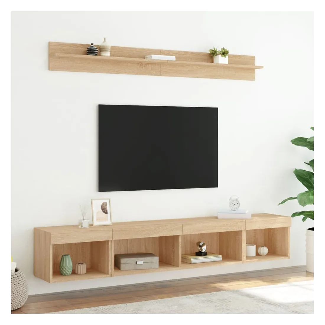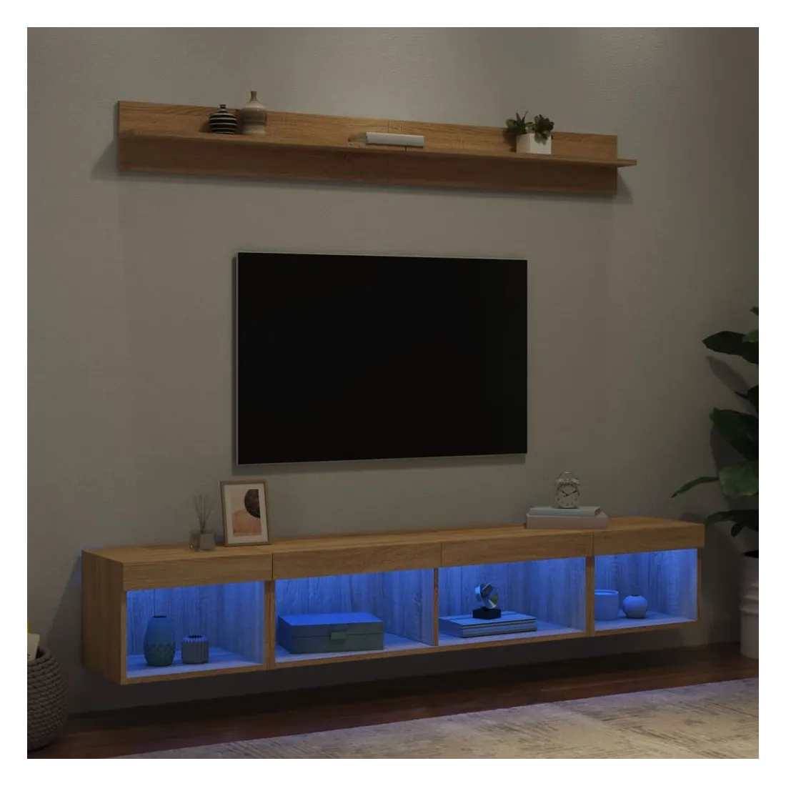 Ces unités murales TV sont la solution parfaite pour votre espace de vie afin de maximiser l'espace et de garder les surfaces au sol sans encombrement. Matériau robuste : le bois d'ingénierie est d'une qualité exceptionnelle avec une surface lisse et présente également résistance, stabilité et résistance à l'humidité.Lumières LED RVB : la unité TV est équipée de lumières LED RVB vibrantes. Avec divers menus personnalisables, vous pouvez changer sans effort la couleur des lumières et même les régler automatiquement. Ces lumières LED renforcent non seulement l'aspect contemporain du meuble TV flottant, mais aussi son attrait pour la mode.Design mural : le meuble de télévision peut être fixé au mur pour ajouter un espace de stockage supplémentaire. De cette façon, vous pouvez maximiser votre espace au sol et garder la zone propre.Grand espace de rangement : le meuble TV flottant est doté de différentes options de rangement, offrant ainsi un grand espace pour ranger vos objets quotidiens tels que les livres, les DVD, les accessoires multimédias et d'autres articles bien organisés et à portée de main.Design polyvalent : vous pouvez l'utiliser comme meuble TV ou le monter sur le mur du lieu de travail pour un rangement pratique des outils ou d'autres articles divers. De plus, il transforme un mur vide en un élément de décoration. Bon à savoir :Les vis et les chevilles pour l'intérieur du mur ne sont pas incluses. Nous vous conseillons de trouver et d'utiliser des vis et des chevilles adaptées spécifiquement à vos murs. Si vous n'êtes pas sûr, vous pouvez consulter un professionnel. Veuillez lire et suivre chaque étape des instructions.Ce produit est doté d'un connecteur USB qui nécessite une source d'alimentation USB de 5V certifiée (non incluse).