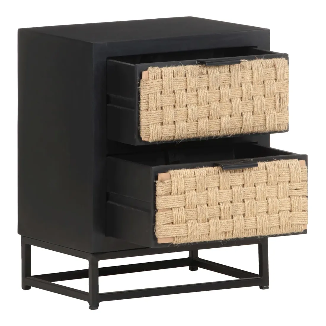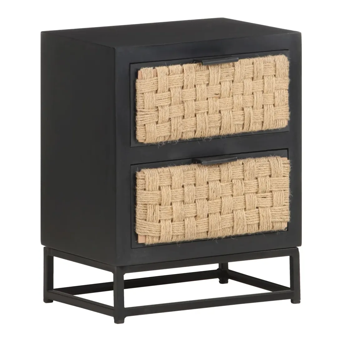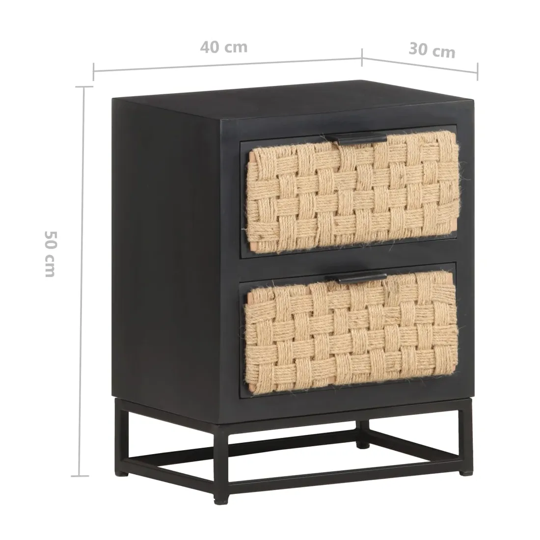 - Matériau : bois de manguier massif avec finition noire, fer avec finition enduite de poudre noire, jute