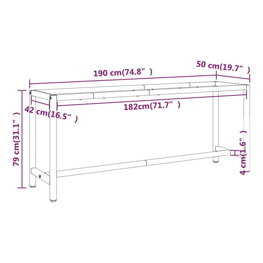 Ce cadre de banc de travail en métal robuste peut être utilisé à plusieurs occasions et répondre à vos différents besoins. Avec ses pieds enduits de poudre, le cadre de table est durable et peut résister à une utilisation intensive. Les côtés supérieur et inférieur sont conçus avec une barre renforcée pour plus de soutien et de résistance. Les trous pré-percés en haut vous permettent de fixer facilement n'importe quel dessus de table selon vos besoins.