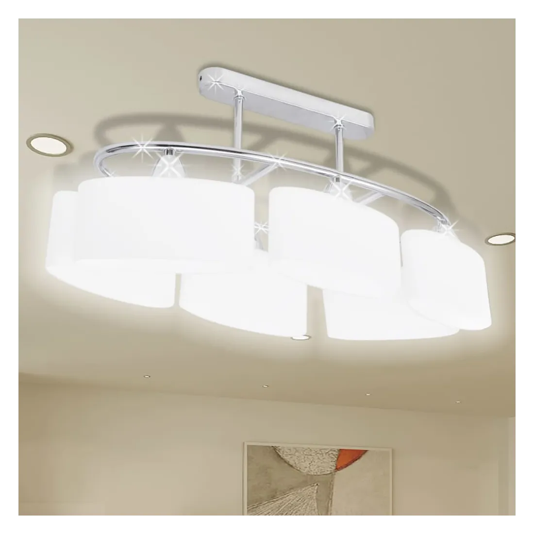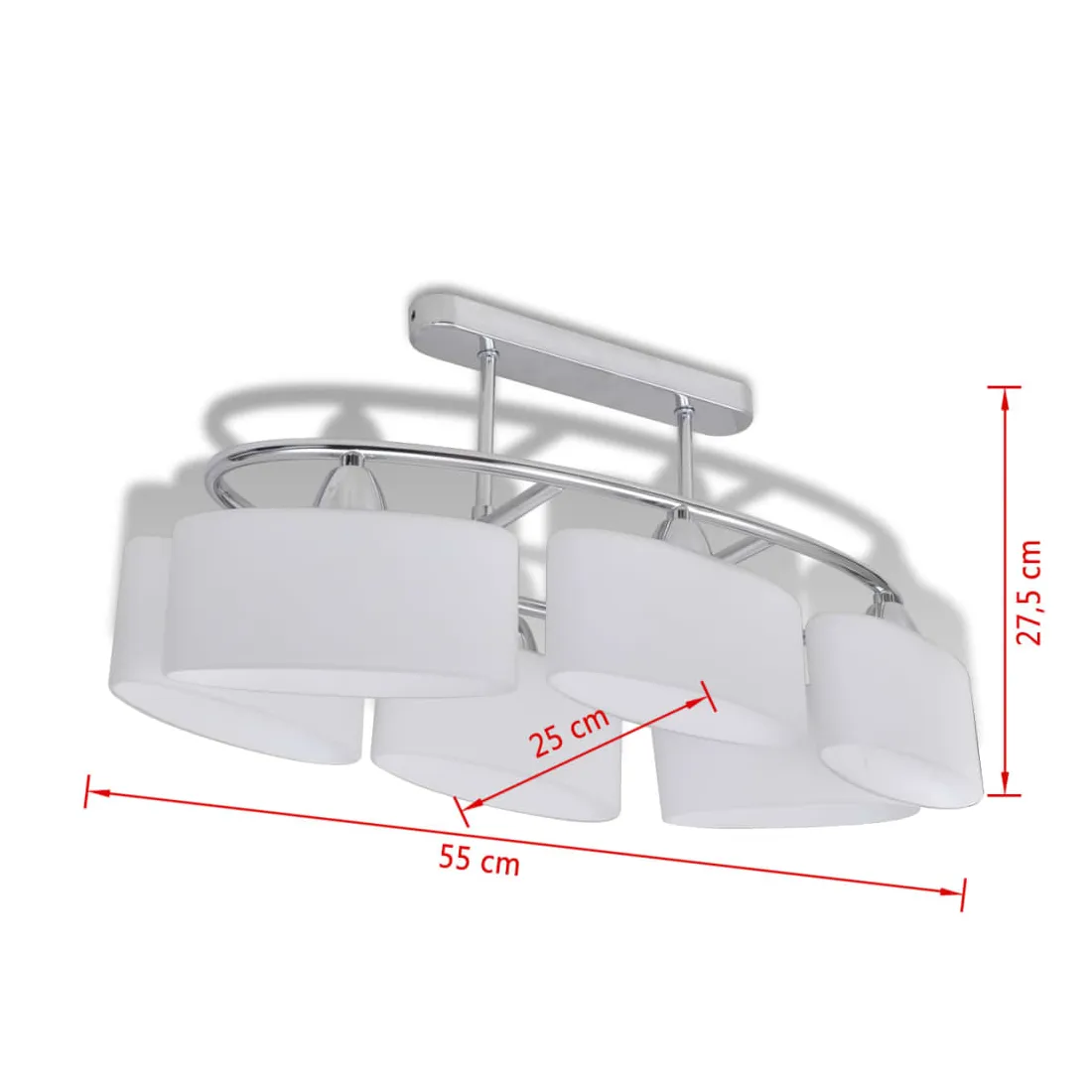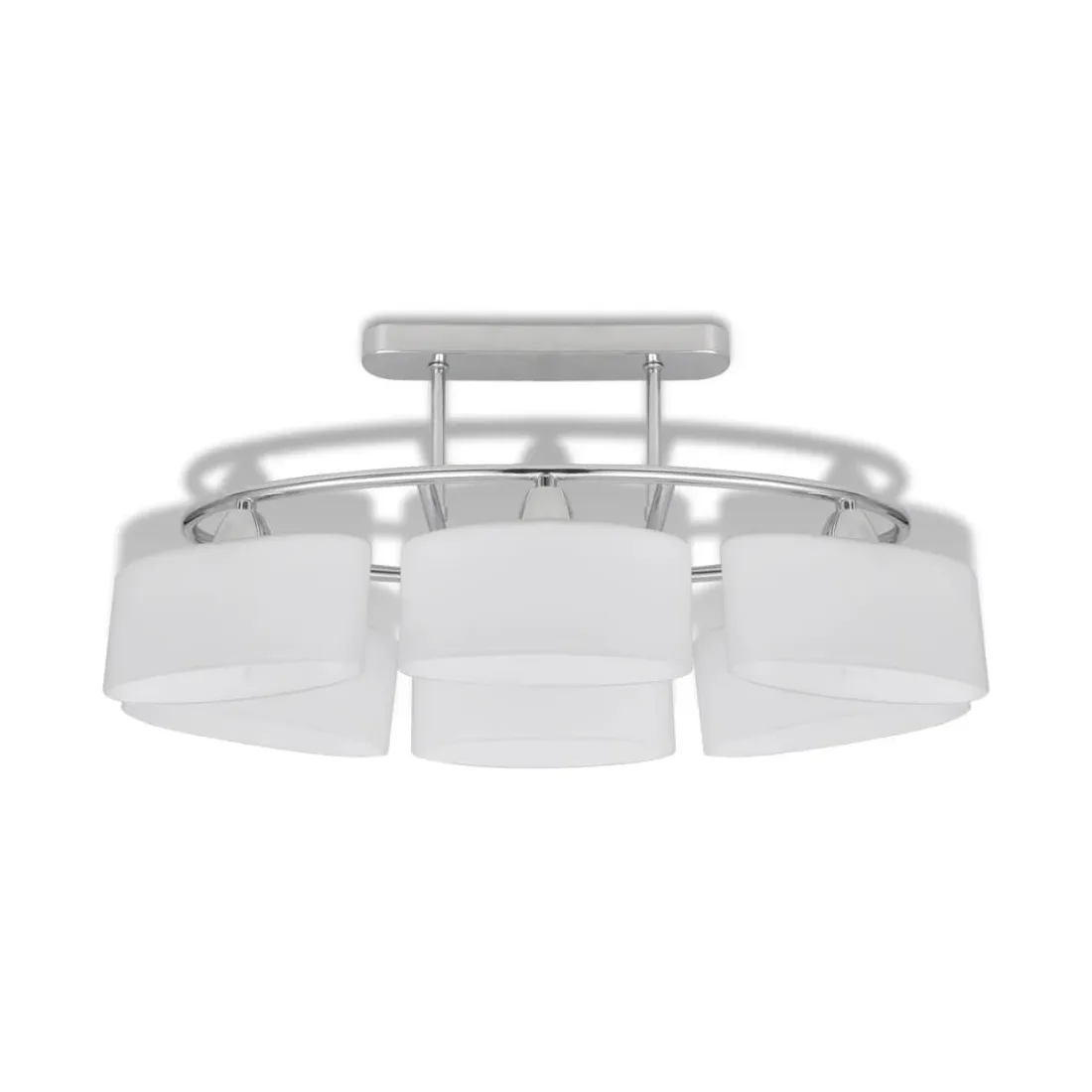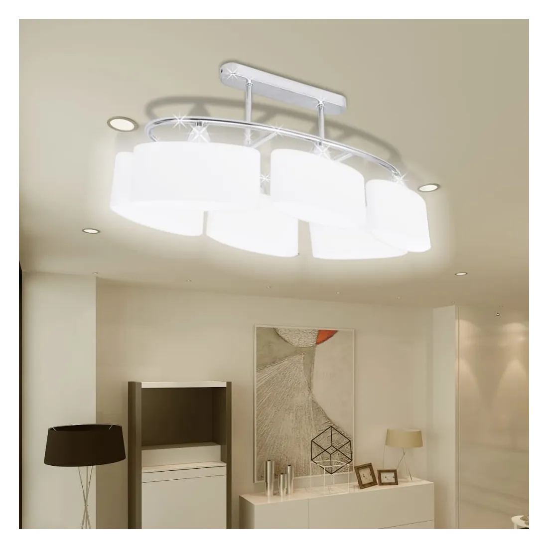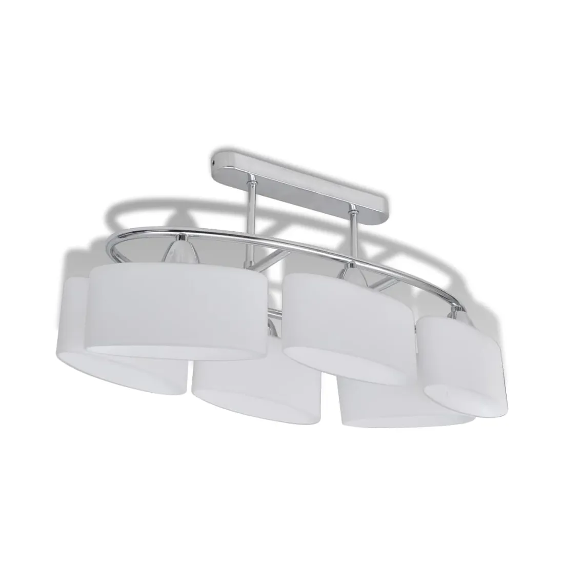 Ce plafonnier unique, avec six abat-jour en verre, présente un design moderne. La finition chromée donne à cette lampe un style contemporain - parfaite pour le salon ou la chambre à coucher avec n'importe quel style. Cette lampe peut être facilement montée sur n'importe quel plafond avec une base en métal cuboïde de haute qualité. Une lumière merveilleuse passera à travers ces délicats abat-jour ellipsoïdes, illuminant chaque coin de la pièce. Ce plafonnier exclusif se distingue par sa simplicité agréable. Cette lampe convient à six ampoules E14. Veuillez noter que les ampoules ne sont pas incluses dans la livraison.