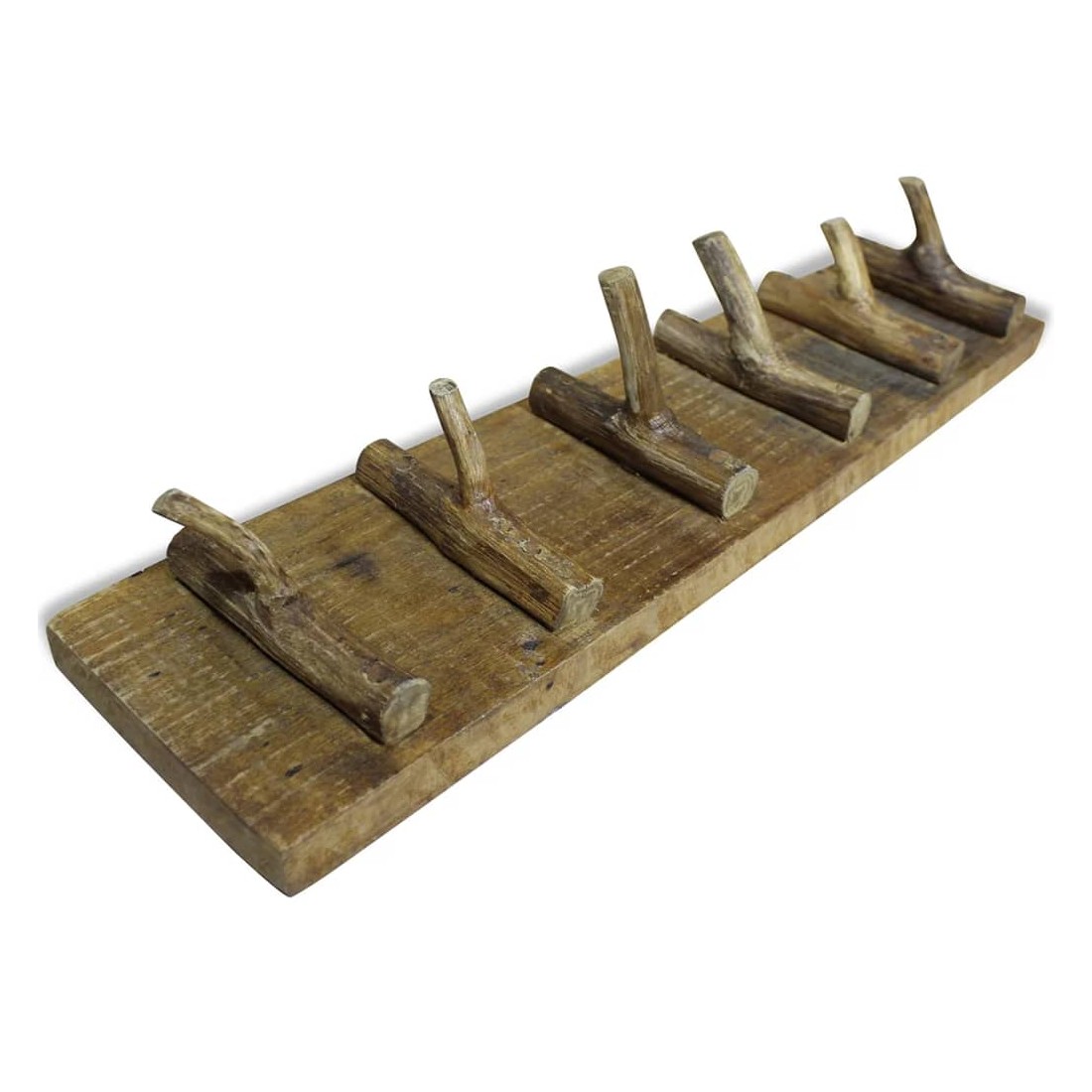 Ce porte-manteau en bois rustique sera un accessoire pratique et décoratif pour votre maison. Le porte-manteau est en bois de récupération massif, qui a les caractéristiques de différents bois comme l'acajou, le teck, le bois dur, le bois du manguier, l'acacia, etc. Vous pouvez trouver des cavités laissées par des clous, des vis ou des boulons avec d'autres imperfections, soulignant l'authenticité du matériau. Ces imperfections révèlent une histoire riche et ne sont jamais réalisées intentionnellement. Le bois provient d'arbres tombés naturellement, de bateaux en bois, de maisons en bois, etc. Chaque pièce de ce meuble est unique et légèrement différente de la suivante. Les signes d'usure et l'artisanat de ce porte-manteau entièrement fait à la main donnent à chaque pièce un look unique et s'ajoutent à son style vintage spectaculaire. Avec 6 patères, le support offre un espace suffisant pour accrocher vos écharpes, cravates, manteaux, sacs, chapeaux, clés, etc. Remarque importante : les couleurs peuvent varier d'une pièce à l'autre, rendant chacun de nos porte-manteaux unique. La livraison est aléatoire, ce qui garantit l'exclusivité et l'individualité de votre produit.
