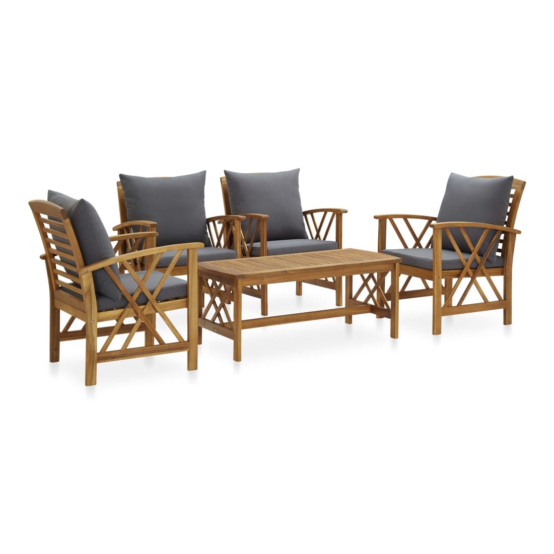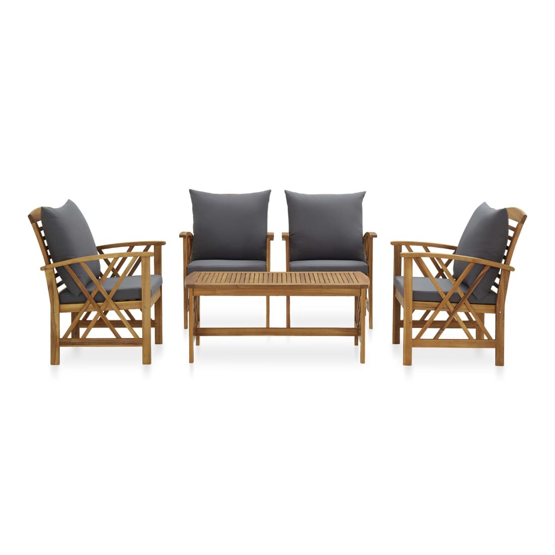 L'ensemble de salon de jardin en bois ajoute un look vintage et est spécialement conçu pour votre jardin, patio ou autre espace de vie extérieur ! L’ensemble de meubles d’extérieur est construit en bois d'acacia massif avec une finition à l’huile, ce qui le rend stable et durable. Les coussins épais d'assise et de dossier rendent l'ensemble doux pour vous y asseoir. Grâce au dessus de table en bois massif au design à lattes, la table basse vous offre de l’espace pour mettre vos collations, paniers de fruits, objets décoratifs, ainsi que d’autres essentiels. Le dossier légèrement incurvé et les accoudoirs ajoutent au confort d'assise de la chaise. Remarque importante : les couleurs et les grains varient d'une pièce à l'autre, rendant chaque pièce unique. La livraison est aléatoire, ce qui garantit l'exclusivité et l'individualité de votre produit.