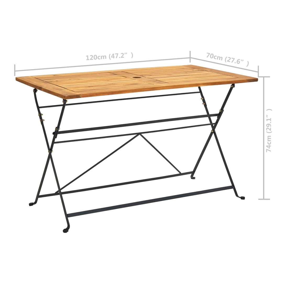Cet élégant ensemble de salle à manger en bois en plein air ajoute de l’espace et une touche de charme rustique à votre jardin, terrasse ou patio ! Cet ensemble de salle à manger de jardin est fabriqué en bois d’acacia massif, un bois dur tropical, qui est résistant aux intempéries et très durable. L’acier robuste offre également une stabilité supplémentaire. La table et les chaises sont faciles à nettoyer avec un chiffon humide et peuvent être pliées pour économiser de l’espace lorsqu'elles ne sont pas utilisées. De plus, un trou de 5 cm de diamètre au centre de la table est prêt pour un parasol. Remarque : afin de prolonger la durée de vie des meubles d'extérieur, nous vous recommandons de les protéger avec une housse imperméable.