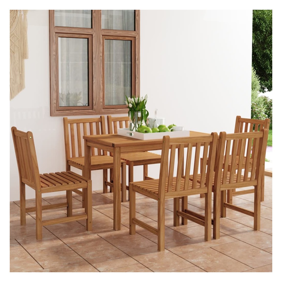Cet ensemble de salle à manger de jardin en bois ajoute une touche de charme naturel à votre cuisine, jardin ou terrasse. Fabriquée en bois dur de teck extrêmement durable, cette pièce de meuble en teck a été chevronnée, séchée au four puis finement poncée pour lui donner un aspect très lisse. Le bois de teck est connu pour sa résistance exceptionnelle aux intempéries, ce qui le rend bien plus adapté aux meubles de jardin que tout autre type de bois. Le bois de teck est le choix idéal si vous souhaitez acheter une pièce de meubles de jardin durable. Une belle finition à base d'eau est appliquée pour donner au bois une couleur chaude. Grâce au dessus de table extra épais et aux grands pieds, cette table en bois solide est très durable et peut accueillir confortablement vos invités. Les chaises ont un look raffiné qui peut s'intégrer instantanément dans n'importe quel espace de vie. Avec sa fonction de résistance à l'eau et son aspect classique, vous pouvez placer cet ensemble de meubles partout autour de votre maison - à l'intérieur ou à l'extérieur !