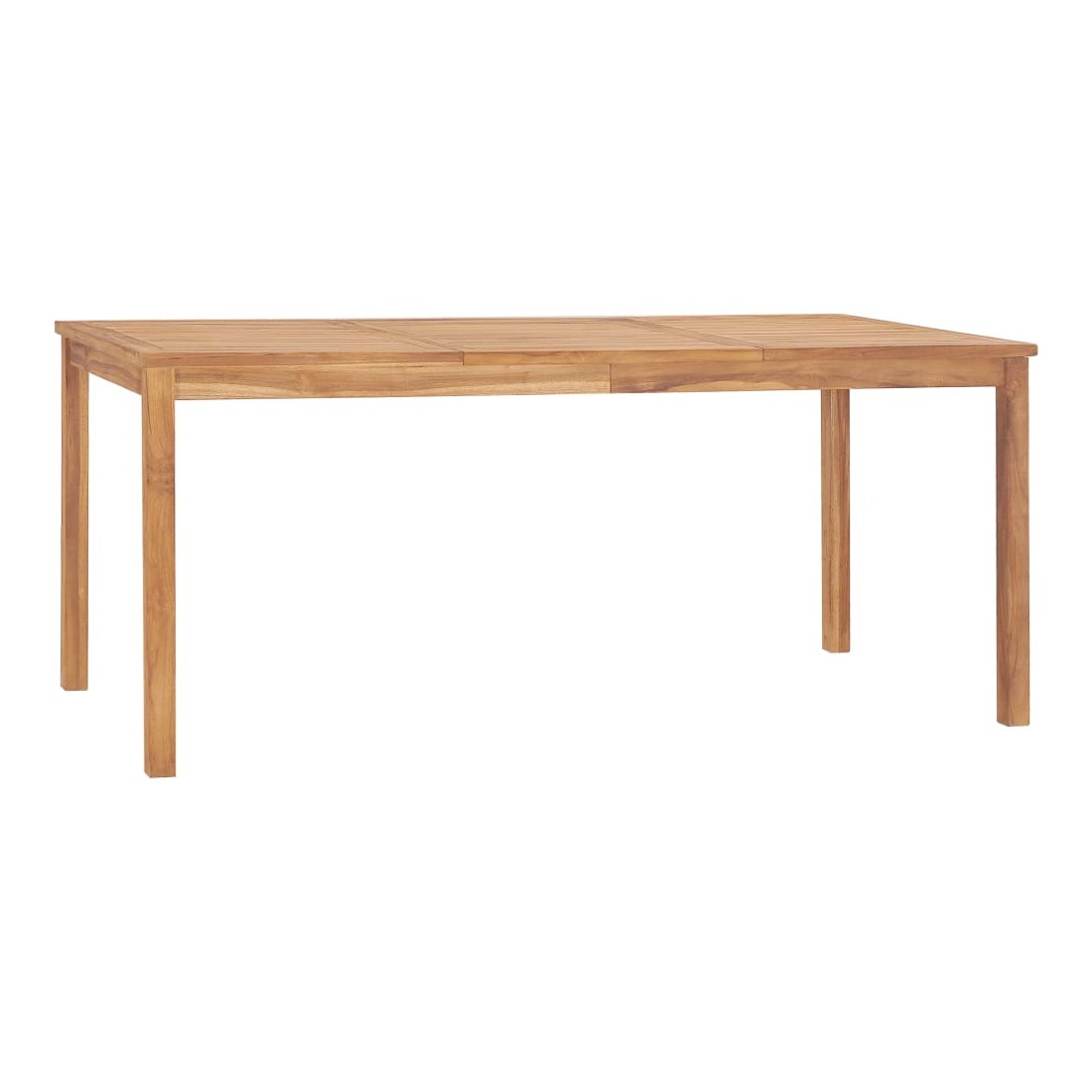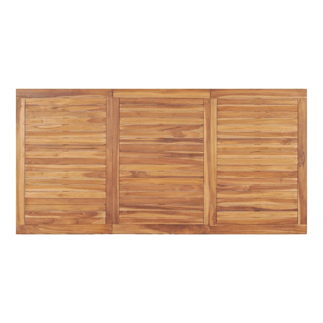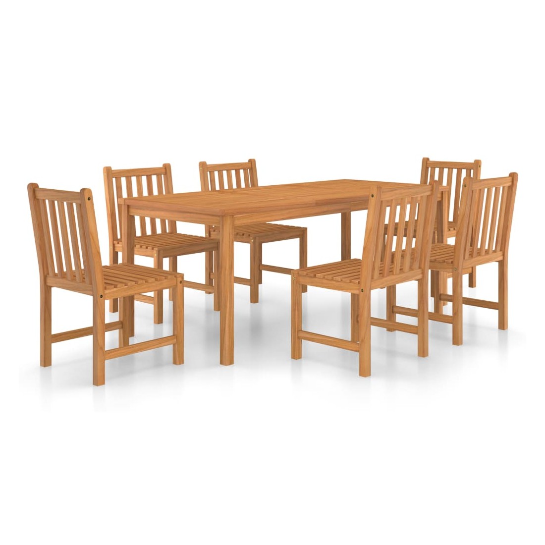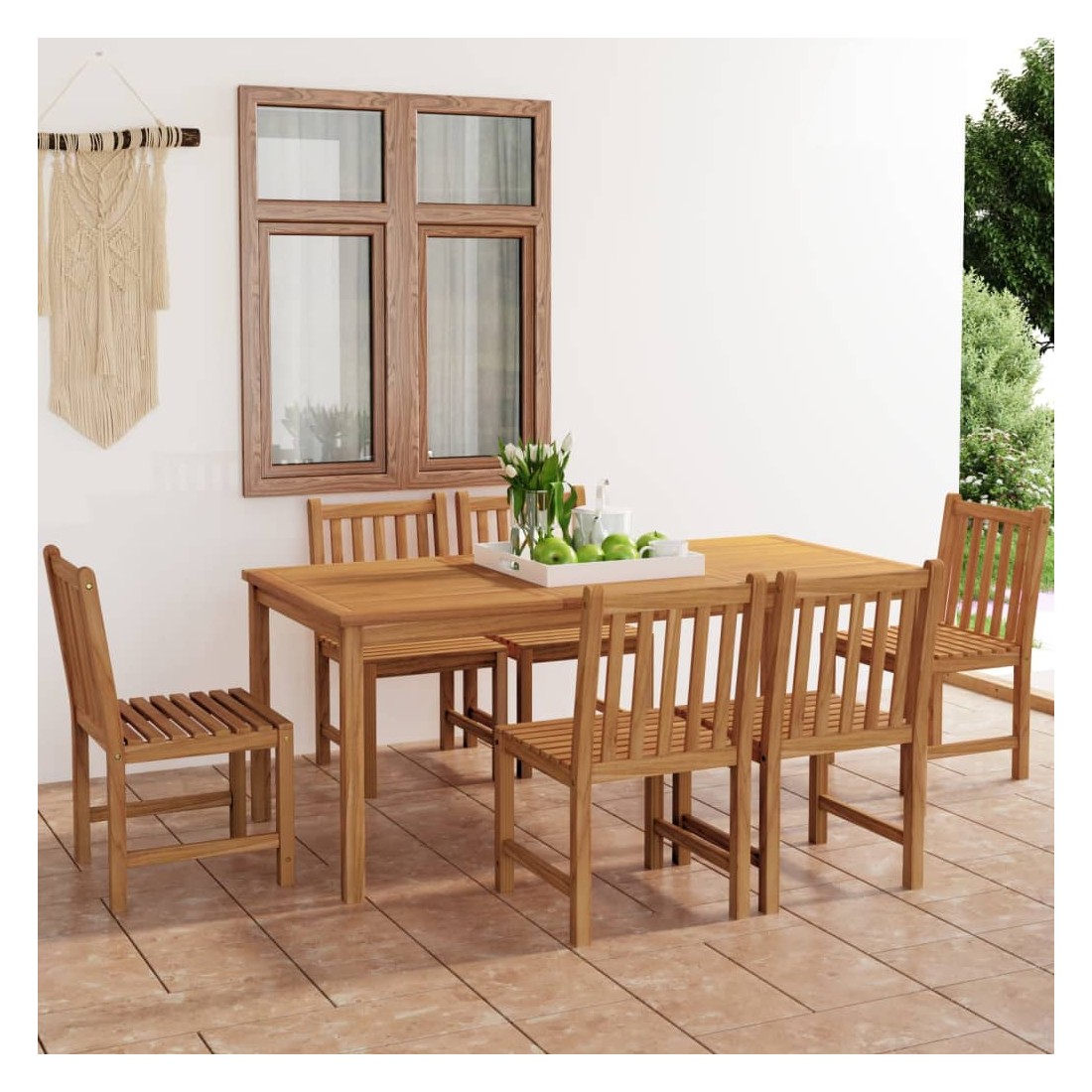vidaXLCet ensemble de salle à manger de jardin en bois ajoute une touche de charme naturel à votre cuisine, jardin ou terrasse. Fabriquée en bois dur de teck extrêmement durable, cette pièce de meuble en teck a été chevronnée, séchée au four puis finement poncée pour lui donner un aspect très lisse. Le bois de teck est connu pour sa résistance exceptionnelle aux intempéries, ce qui le rend bien plus adapté aux meubles de jardin que tout autre type de bois. Le bois de teck est le choix idéal si vous souhaitez acheter une pièce de meubles de jardin durable. Une belle finition à base d'eau est appliquée pour donner au bois une couleur chaude. Grâce au dessus de table extra épais et aux grands pieds, cette table en bois solide est très durable et peut accueillir confortablement vos invités. Les chaises ont un look raffiné qui peut s'intégrer instantanément dans n'importe quel espace de vie. Avec sa fonction de résistance à l'eau et son aspect classique, vous pouvez placer cet ensemble de meubles partout autour de votre maison - à l'intérieur ou à l'extérieur !