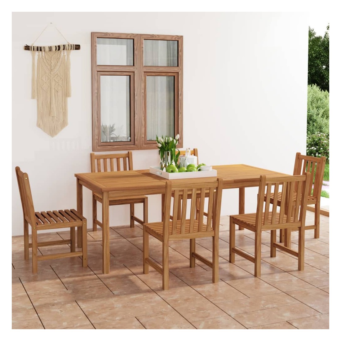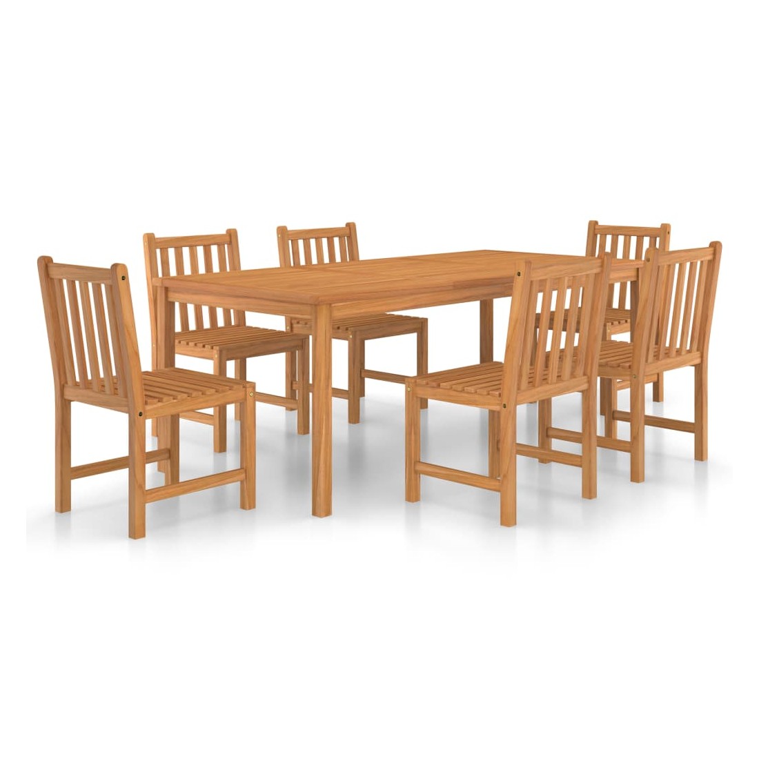 Cet ensemble de salle à manger de jardin en bois ajoute une touche de charme naturel à votre cuisine, jardin ou terrasse. Fabriquée en bois dur de teck extrêmement durable, cette pièce de meuble en teck a été chevronnée, séchée au four puis finement poncée pour lui donner un aspect très lisse. Le bois de teck est connu pour sa résistance exceptionnelle aux intempéries, ce qui le rend bien plus adapté aux meubles de jardin que tout autre type de bois. Le bois de teck est le choix idéal si vous souhaitez acheter une pièce de meubles de jardin durable. Une belle finition à base d'eau est appliquée pour donner au bois une couleur chaude. Grâce au dessus de table extra épais et aux grands pieds, cette table en bois solide est très durable et peut accueillir confortablement vos invités. Les chaises ont un look raffiné qui peut s'intégrer instantanément dans n'importe quel espace de vie. Avec sa fonction de résistance à l'eau et son aspect classique, vous pouvez placer cet ensemble de meubles partout autour de votre maison - à l'intérieur ou à l'extérieur !