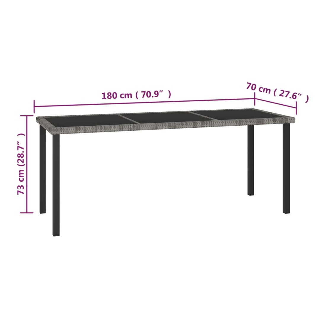 - Dimensions de la table : 180 x 70 x 73 cm (L x l x H)