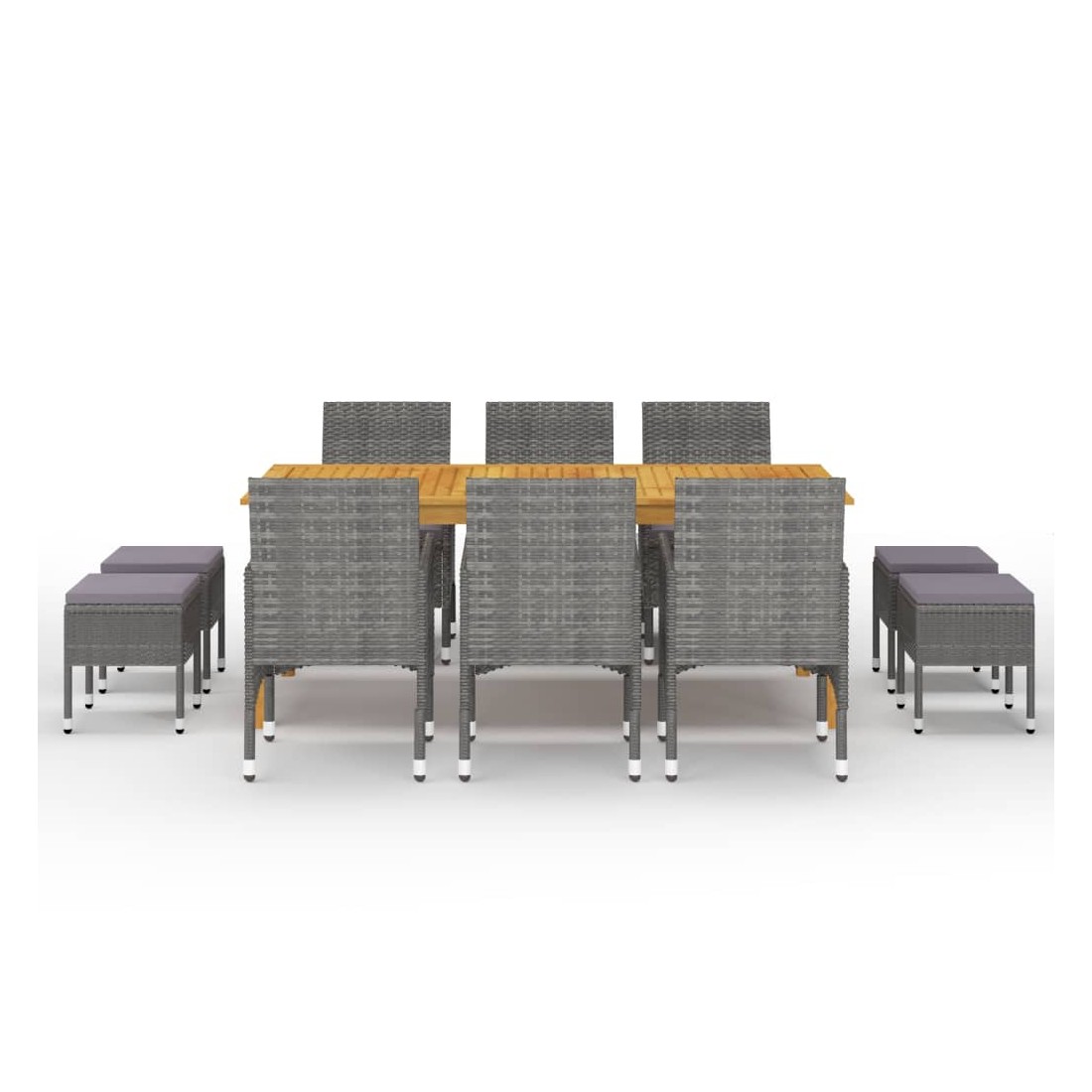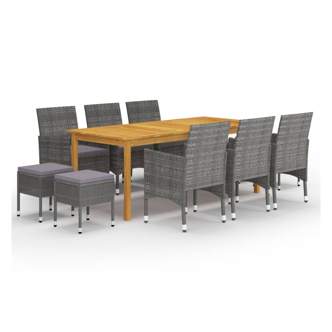 Créez une esthétique convaincante et uniforme dans votre espace extérieur avec cet ensemble de salle à manger de jardin ! La table de salle à manger est en bois d’acacia massif avec une finition à l’huile, ce qui la rend stable, durable et facile à entretenir. Dotés d’un cadre en acier enduit de poudre recouvert de résine tressée résistante aux intempéries, ces chaises et tabourets sont robustes et faciles à nettoyer. Conçue avec un dossier et des accoudoirs incurvés, la chaise à dîner a une forme plus ergonomique pour un confort maximal. Chaque siège est doté d'un coussin rembourré amovible pour ajouter du confort pendant votre temps de détente. Remarque importante : Nous vous recommandons de couvrir l'ensemble de salle à manger pendant la pluie, la neige et le gel pour une utilisation durable.