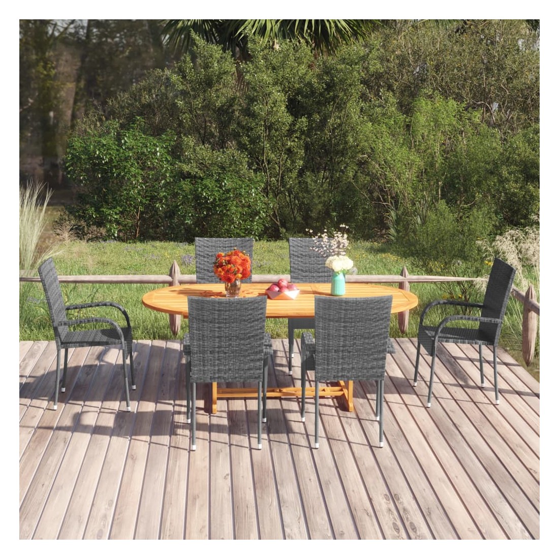 Créez une esthétique convaincante et uniforme dans votre espace extérieur avec cet ensemble de salle à manger de jardin ! La table d’extérieur est fabriquée en bois d’acacia massif, ce qui la rend robuste et stable. La surface à finition à l'huile rend également la table facile à nettoyer avec un chiffon humide. Dotées d’un cadre en acier recouvert de résine tressée résistante aux intempéries, les chaises sont robustes et faciles à nettoyer. Les chaises de jardin peuvent être empilées pour économiser de l’espace lorsqu'elles ne sont pas utilisées. Remarque : afin de prolonger la durée de vie des meubles d'extérieur, nous vous recommandons de les protéger avec une housse imperméable.