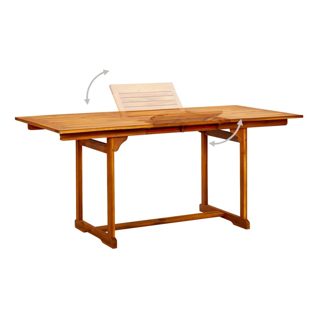 Profitez d'un bon repas en plein air avec votre famille et vos amis avec cet ensemble de salle à manger de jardin en bois ! Matériau de qualité supérieure : cet ensemble de salle à manger est fabriqué en bois d'acacia massif, un bois dur tropical, qui résiste aux intempéries et est durable pour des années d'utilisation. La surface à finition à l'huile est facile à nettoyer avec un chiffon humide.Table extensible : la table à manger est extensible, répondant à vos différents besoins.Chaise réglable et pliable : la chaise d'extérieur peut être réglée sur 5 positions, vous offrant un confort d'assise optimal. Ces chaises de salle à manger peuvent également être pliées pour économiser de l'espace lorsqu'elles ne sont pas utilisées. Remarque :Afin de prolonger la durée de vie de votre mobilier d'extérieur, nous vous recommandons de le protéger avec une housse imperméable.