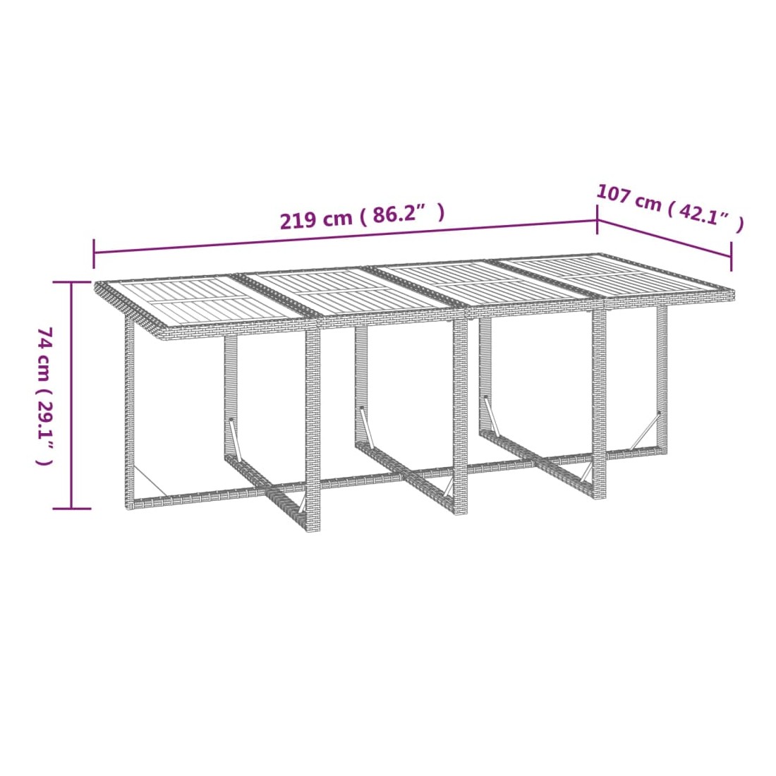 - Dimensions totales de la table : 219 x 107 x 74 cm (L x l x H)