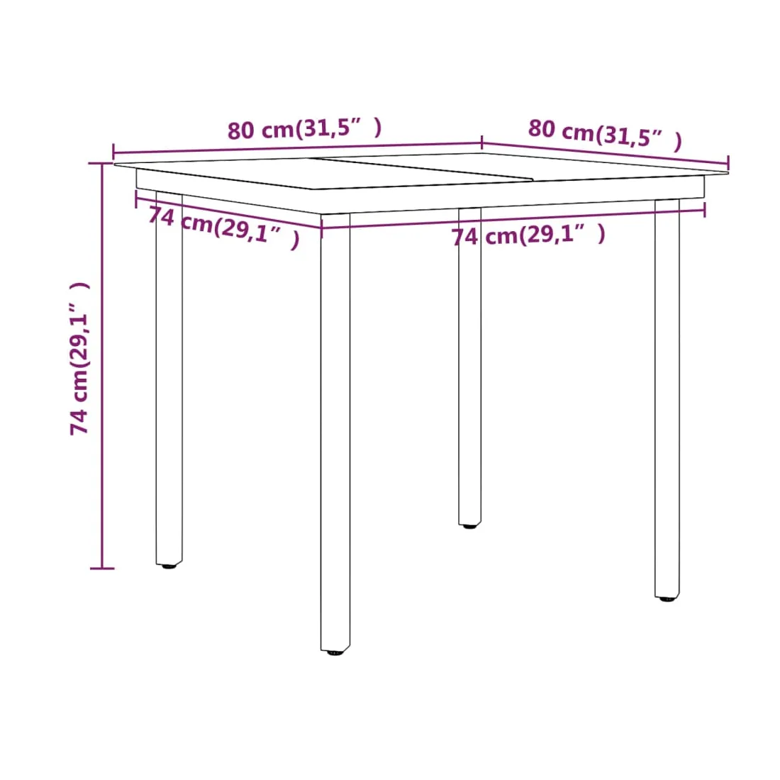 • Dimensions de la table : 80 x 80 x 74 cm (L x I x H)